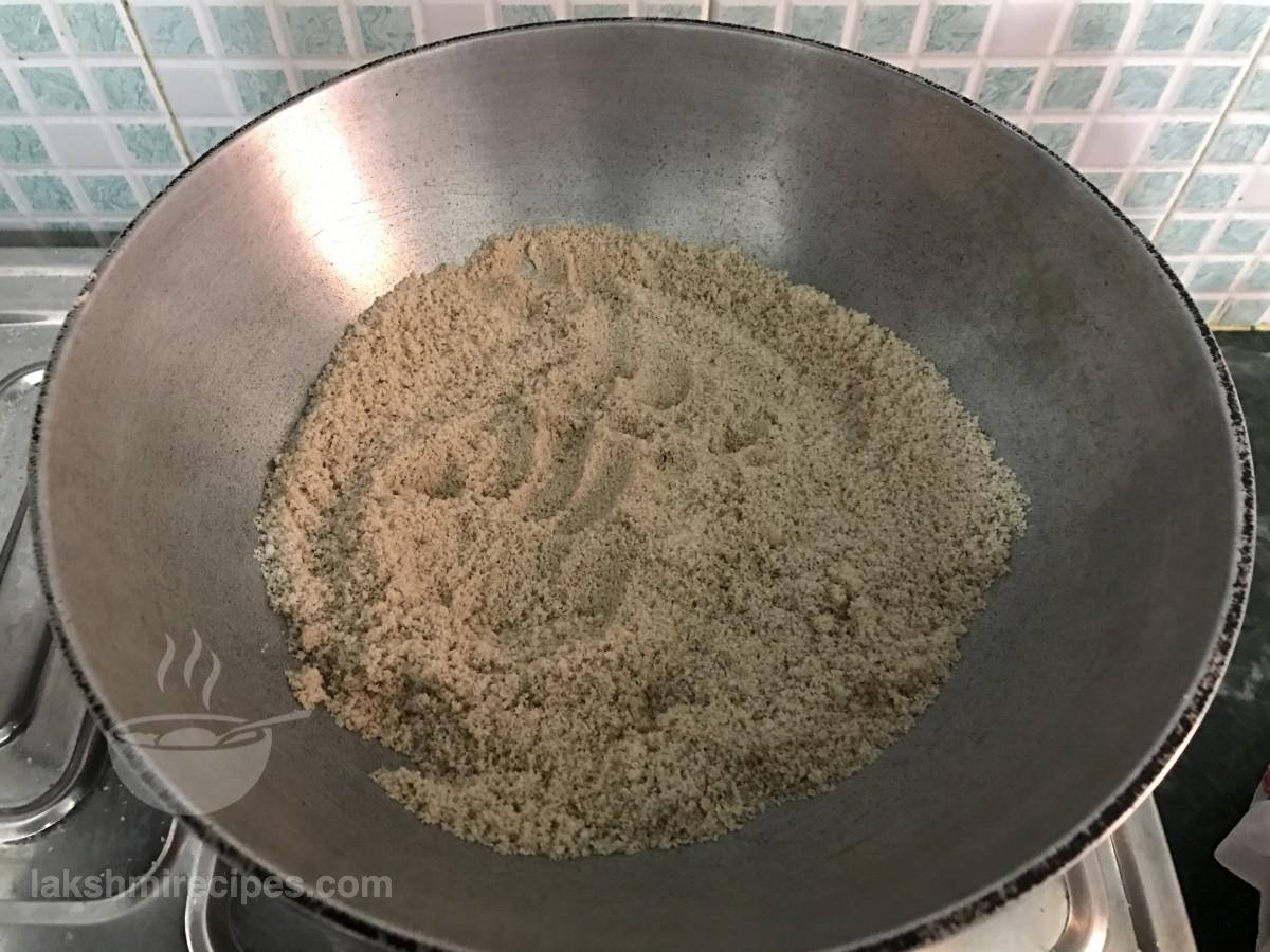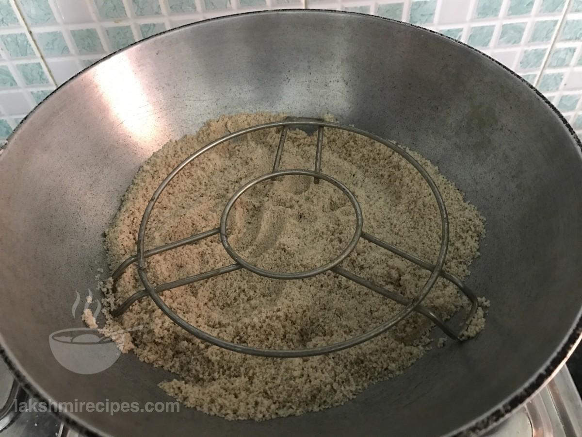 - अब एक मोटी आधार वाली कढ़ाई लें और इसमें 2 कप नमक जोड़ें। एक समान परत बनाने के लिए नमक को अपने हाथों से फैलाएं। इस नमक परत पर एक स्टील का स्टैंड रखें (जैसा कि नीचे दी गई छवि में दिखाया गया है)। यह नमक बर्बाद नहीं होगा और बाद में इस्तेमाल किया जा सकता है। कढ़ाई को 5 मिनट तक अच्छे से गरम करें।