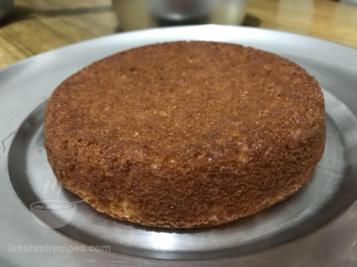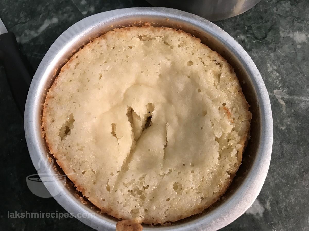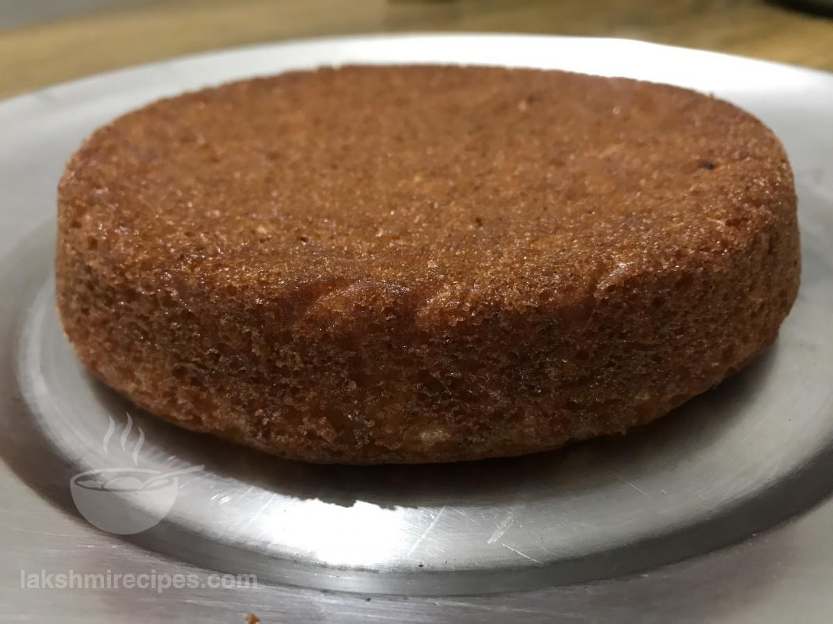 - Remove the cake tin from the kadhai and allow the cake to cool and set nicely.