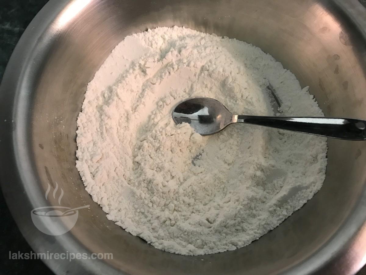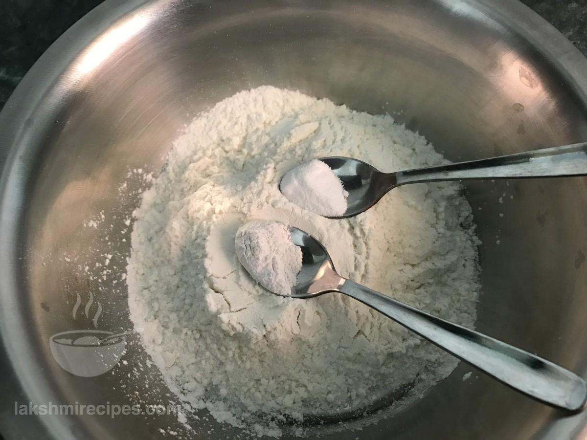 - In a deep mixing bowl take all purpose flour, baking powder and baking soda, and mix the 3 dry ingredients together.