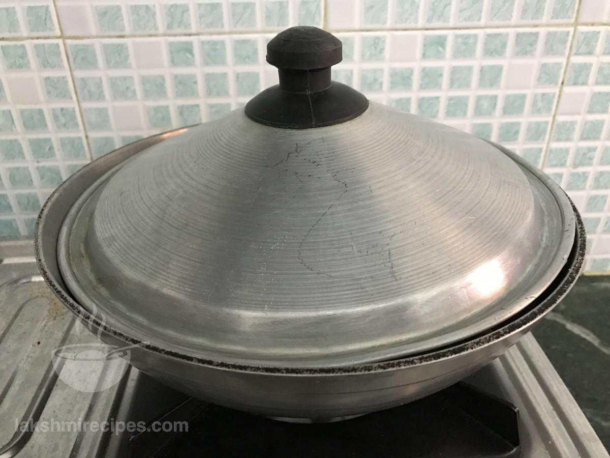 - अब इस केक टिन को कढ़ाई में स्टैंड पर रखें और कढ़ाई को एक ढक्कन के साथ कवर करें। आँच को एकदम कम करें और 35 मिनट के लिए इस तरीके से केक बैटर को पका लें।