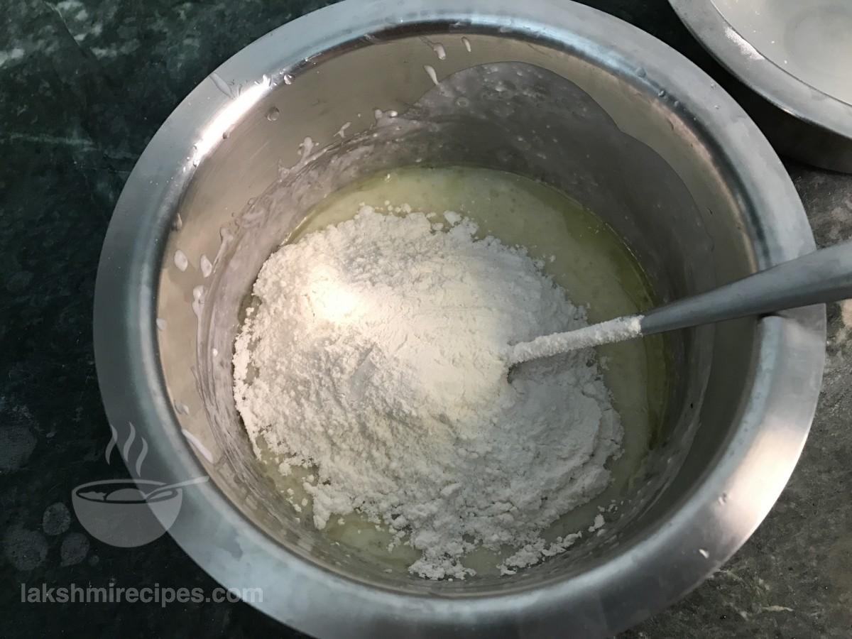 - Then add half of the all purpose flour mixture to the vessel containing the curd mixture. Mix well so that no lumps are formed.