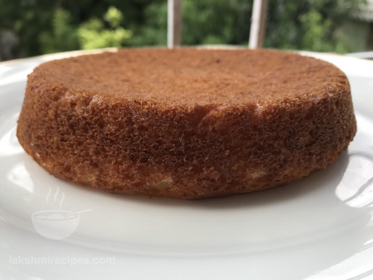 - When the cake has cooled nicely then flip the cake tin upside down over a plate and pat it a little. The cake will come out smoothly. (Remember that, if you will try to take out the cake from the tin when it is still hot then the cake with break and will not come out as a single piece.) The eggless cake is ready to be served.