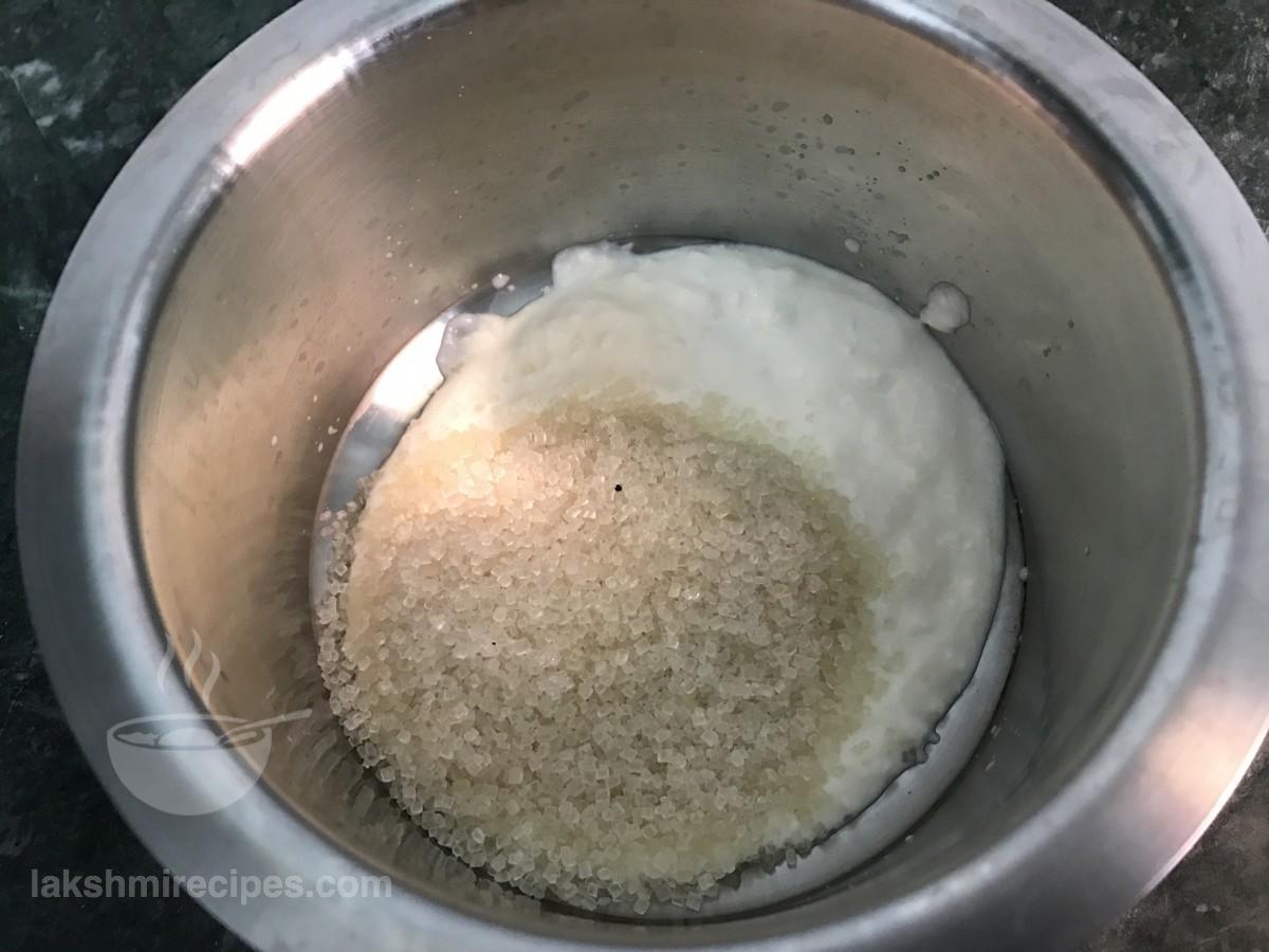 - Now in another deep vessel take curd and sugar and mix the 2 ingredients together until the sugar dissolves completely.
