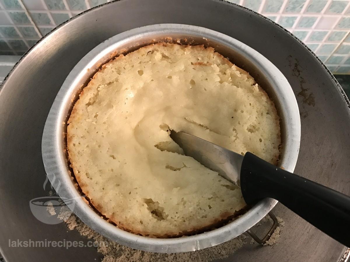 - केक बैटर इस तरह से पकाने से अच्छे से फूलेगा। 35 मिनट के बाद ढक्कन हटाएं और एक चाकू के साथ केक के बीच में डालकर देखें। अगर चाकू साफ बाहर आए, तो इसका मतलब है कि केक अच्छे से पक चुका है और आप आँच बंद कर सकते हैं। अगर चाकू चिपचिपा हो तो कढ़ाई को ढक्कन के साथ फिर से ढककर 5-10 मिनट और केक पका लें। ५-१० मिनट बाद फिर से जाँच करें और फिर आँच बंद करें।
