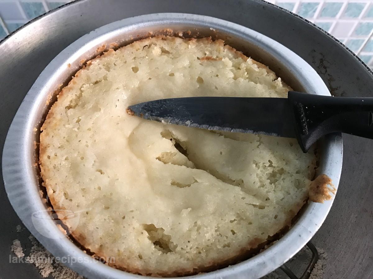 - The cake batter will cook and rise in this time. Remove the lid after 35 minutes and poke the cake at its center with a knife. If the knife comes out clean,then it means that the cake is cooked and you can turn off the flame. If the knife is sticky then cover the kadhai again with its lid and cook the cake for 5-10 minutes more. Check again and then turn off the flame.