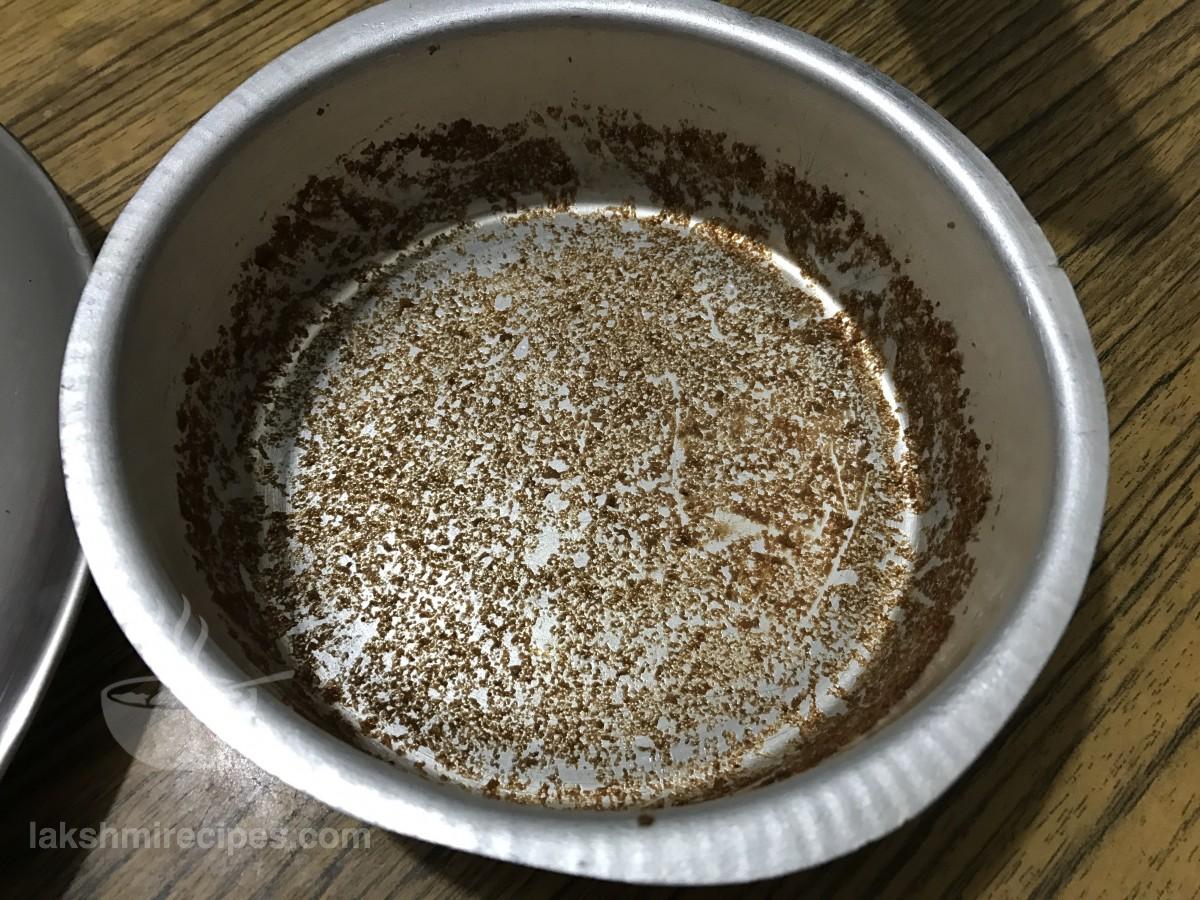 - इस समय के दौरान एक केक टिन लें और 1 छोटी चम्मच तेल को इसके अन्दर की तरह अच्छे से फैला के लगा दें।