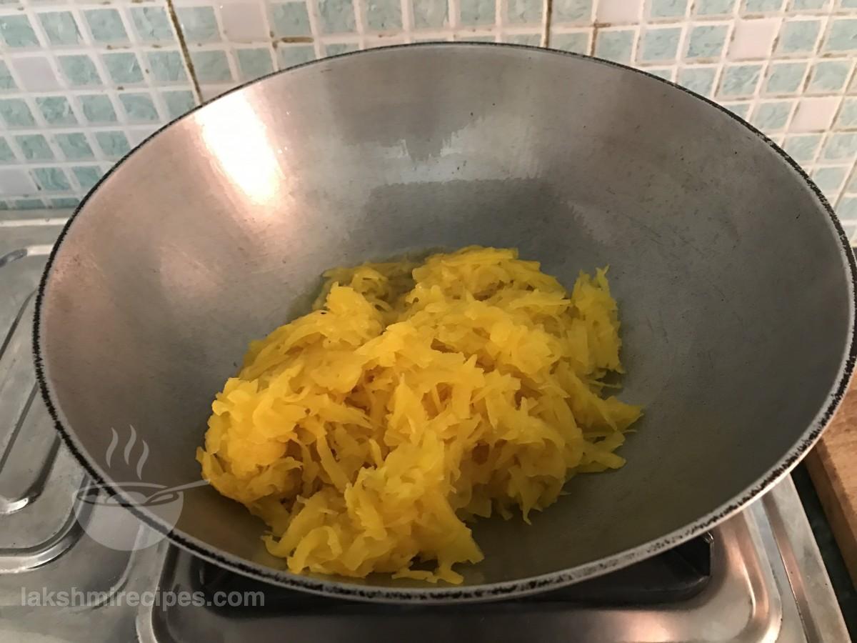 - एक बड़ा गहरे पतीले में थोड़ा पानी उबाल लें और फिर इसमें कद्दूकस किया हुआ कद्दू डालें। कद्दूकस किये हुए कद्दू को पानी में 3-4 मिनट के लिए उबाल लें।