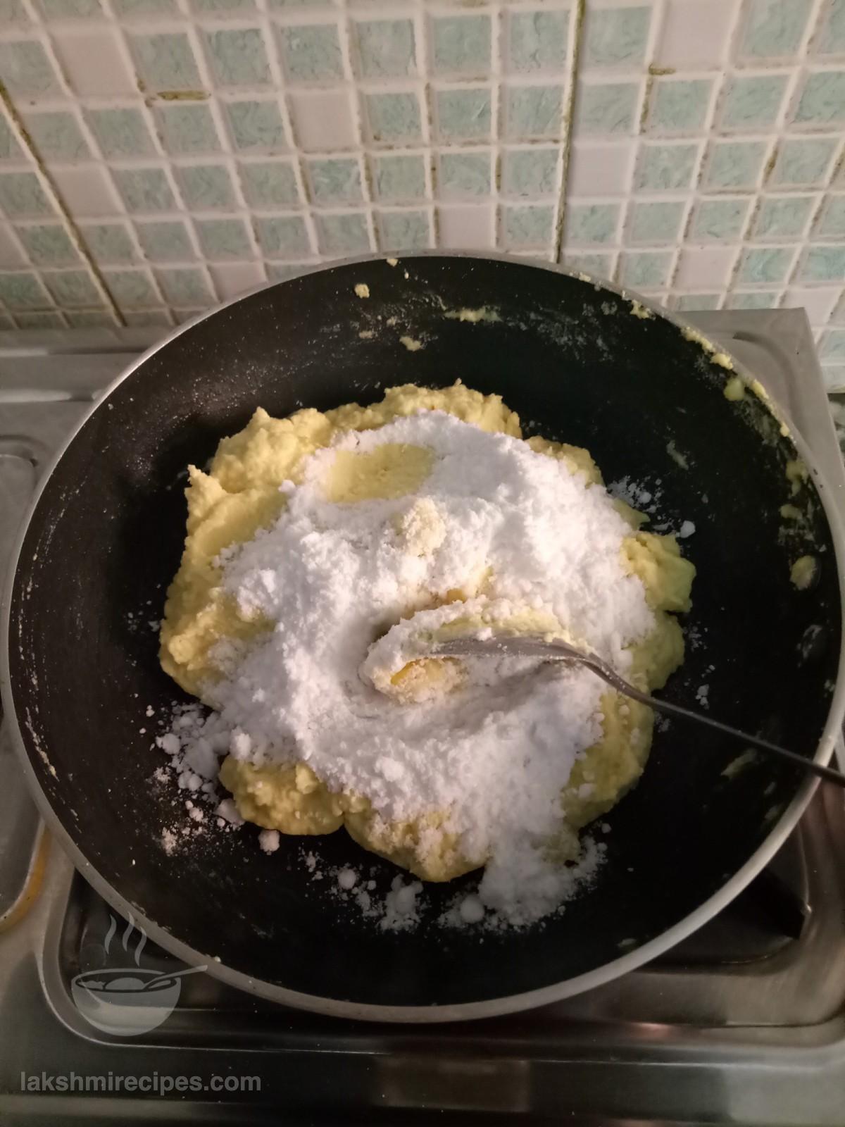 - When you notice the change in color then add sugar powder to the kadhai and mix the ingredients well. When the sugar mixes well with the cooking ingredients then turn off flame after 2 minutes. The mixtuer for kesar almonds burfi or kesar badaam burfi is ready.