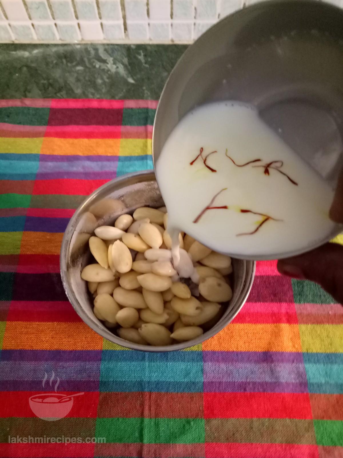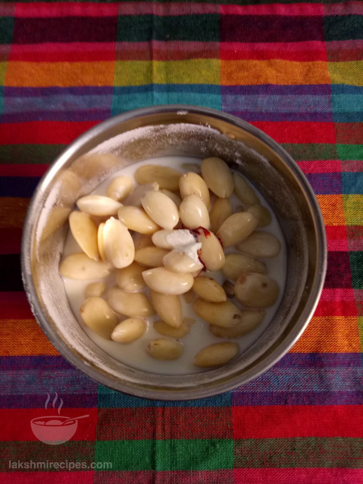 Preparation Time: 6 hour for soaking the almonds + 1 hour for soaking saffron strands in milk + 10 minutes for peeling the