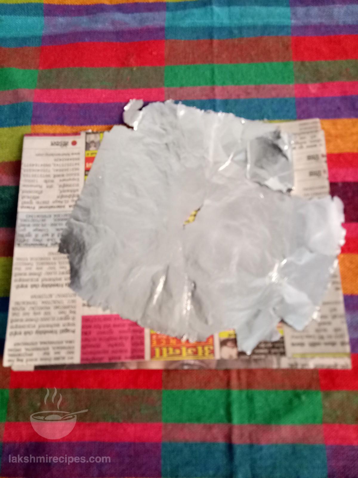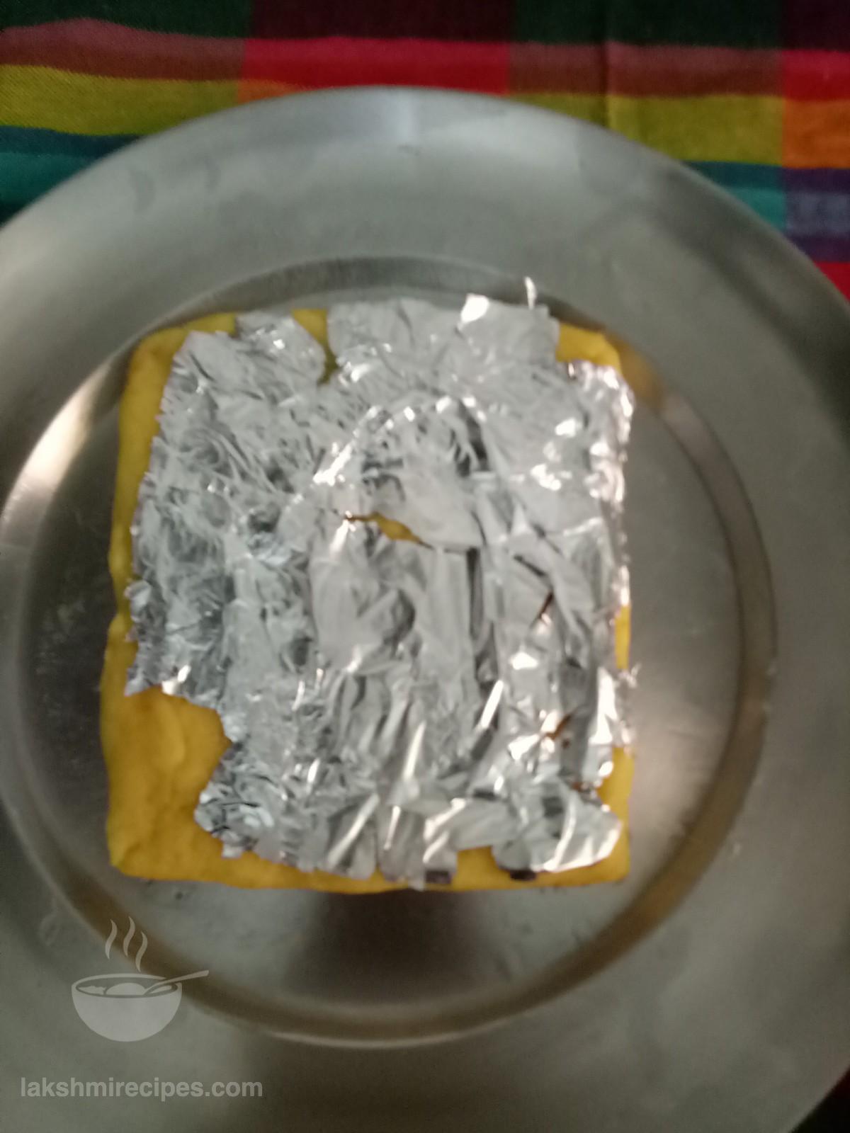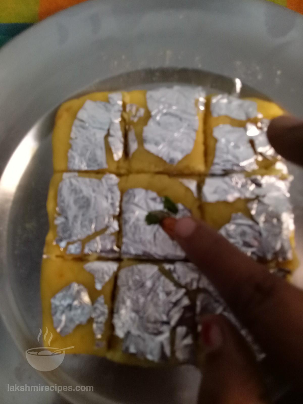 - अब इस केसर बादाम का बर्फी के मिश्रण या केसर बदाम बर्फी के मिश्रण के ऊपर चांदी का वर्क लगाएं जैसा कि नीचे दिए गए चित्र में दिखाया गया है।