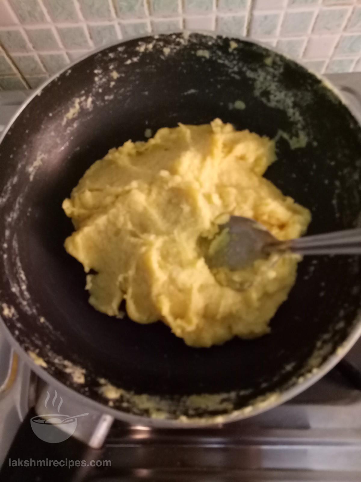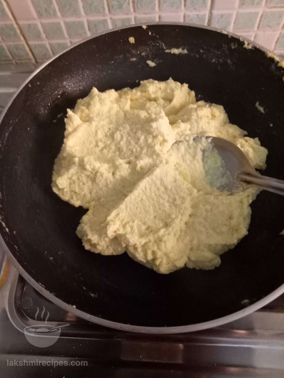 (Tips: Cook the almonds paste or badaam paste in ghee over medium flame only. Cook it only for the specified time. Do not over cook the almonds paste or badaam paste in ghee)
