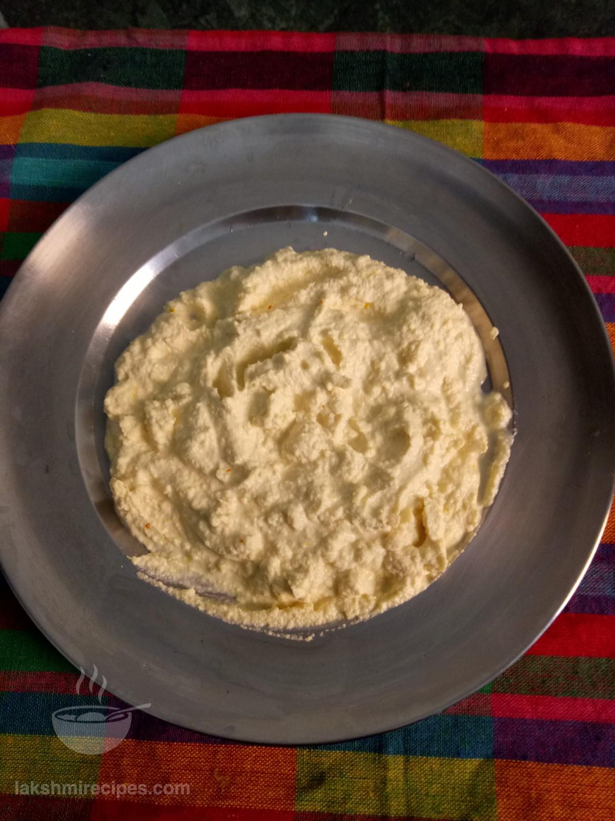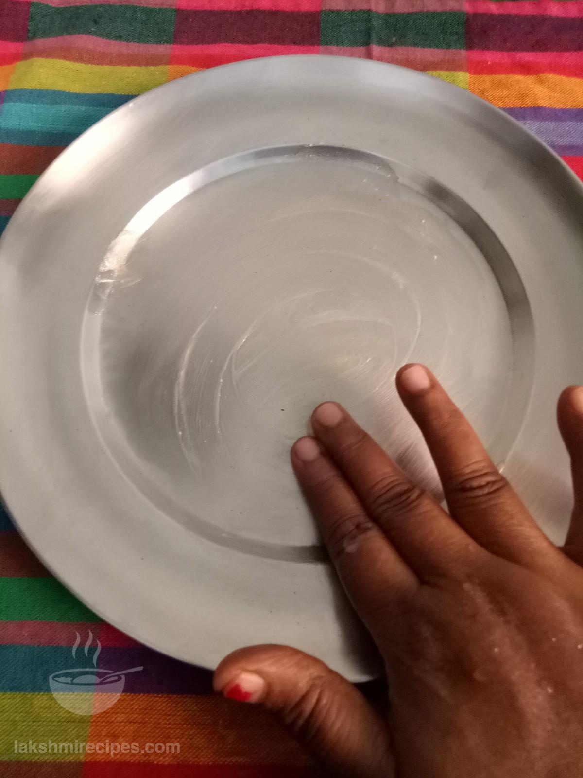 - Grease a steel plate or tray with 1 tea spoon shuddh ghee and transfer the hot kesar almonds burfi mixture or kesar badaam burfi mixture from the kadhai to the plate.