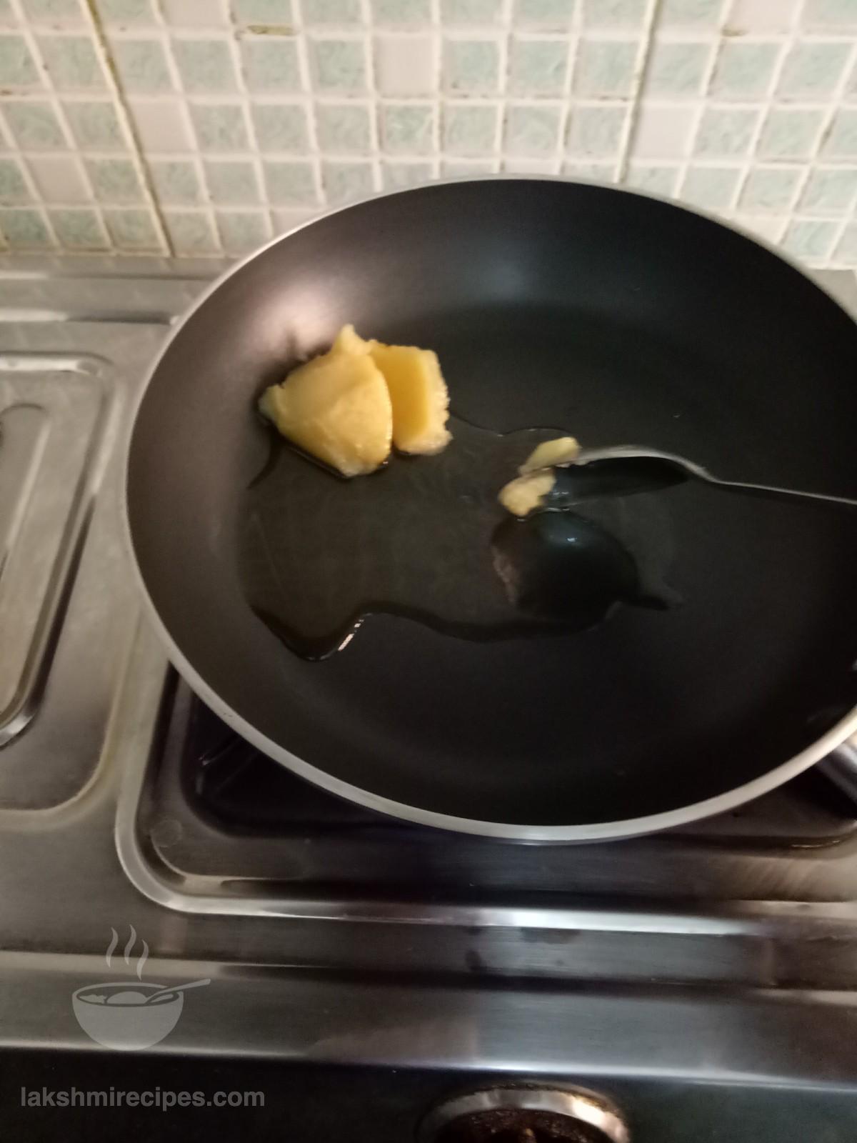 - एक नॉन-स्टिक पैन गरम करें और इसमें 1 बड़ा चम्मच शुध्द घी डालकर गरम करें। जब शुद्ध घी पर्याप्त गरम होजाए तो आँच को मध्यम स्तर तक कम कर दें।