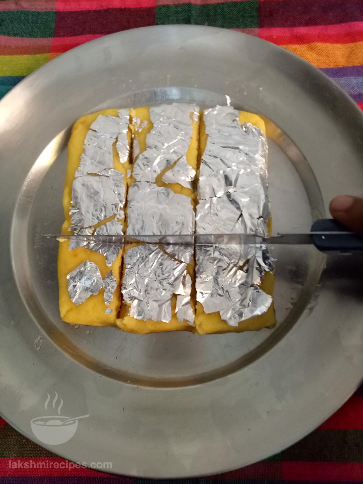- Take out the tray from the refrigerator after the hot kesar almonds burfi mixture or kesar badaam burfi mixture has cooled completely and has set into shape.