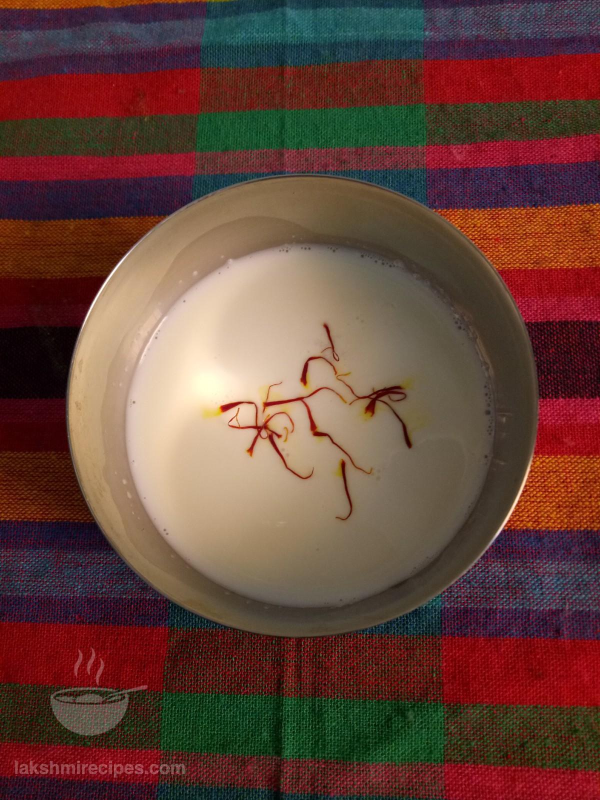 - Take 1/2 small cup milk in a bowl and add 8-10 saffron strands to it. Leave the saffron strands to get soaked in milk for 1 hour.
