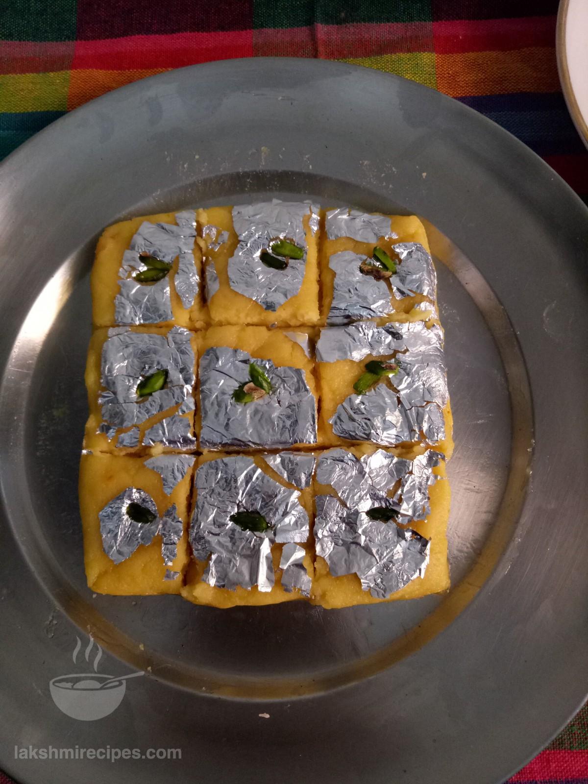 - ठंडा और सेट किये हुए केसर बादाम के बर्फी मिश्रण या केसर बदाम बर्फी के मिश्रण को मन चाहे आकार में काटें। सुंदर, मोहक और स्वादिष्ट केसर बादाम बर्फी या केसर बदाम बर्फी तैयार हैं। आप इन्हे व्रत, पूजन, त्यौहर इत्यादि के दौरान बना सकते हैं।