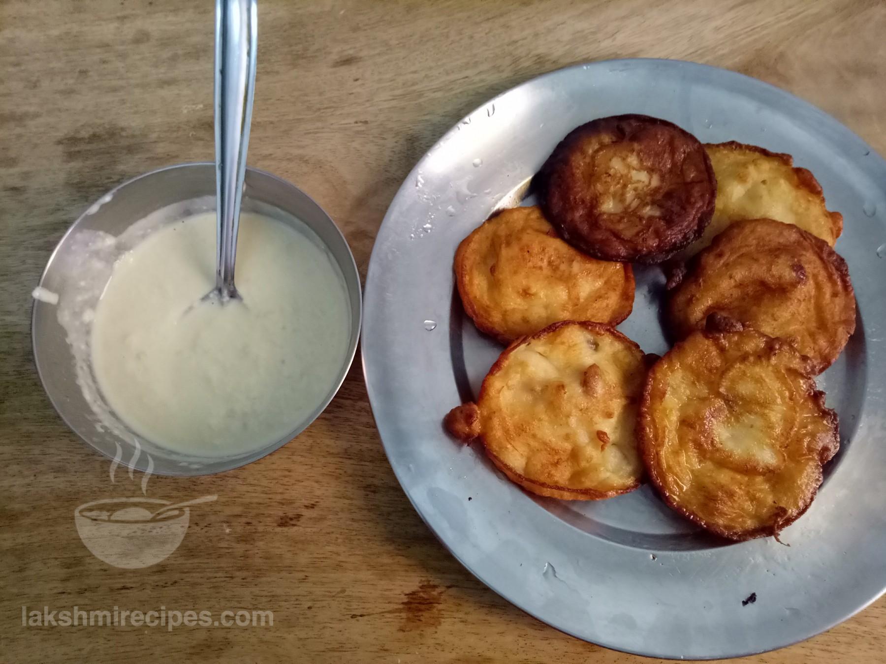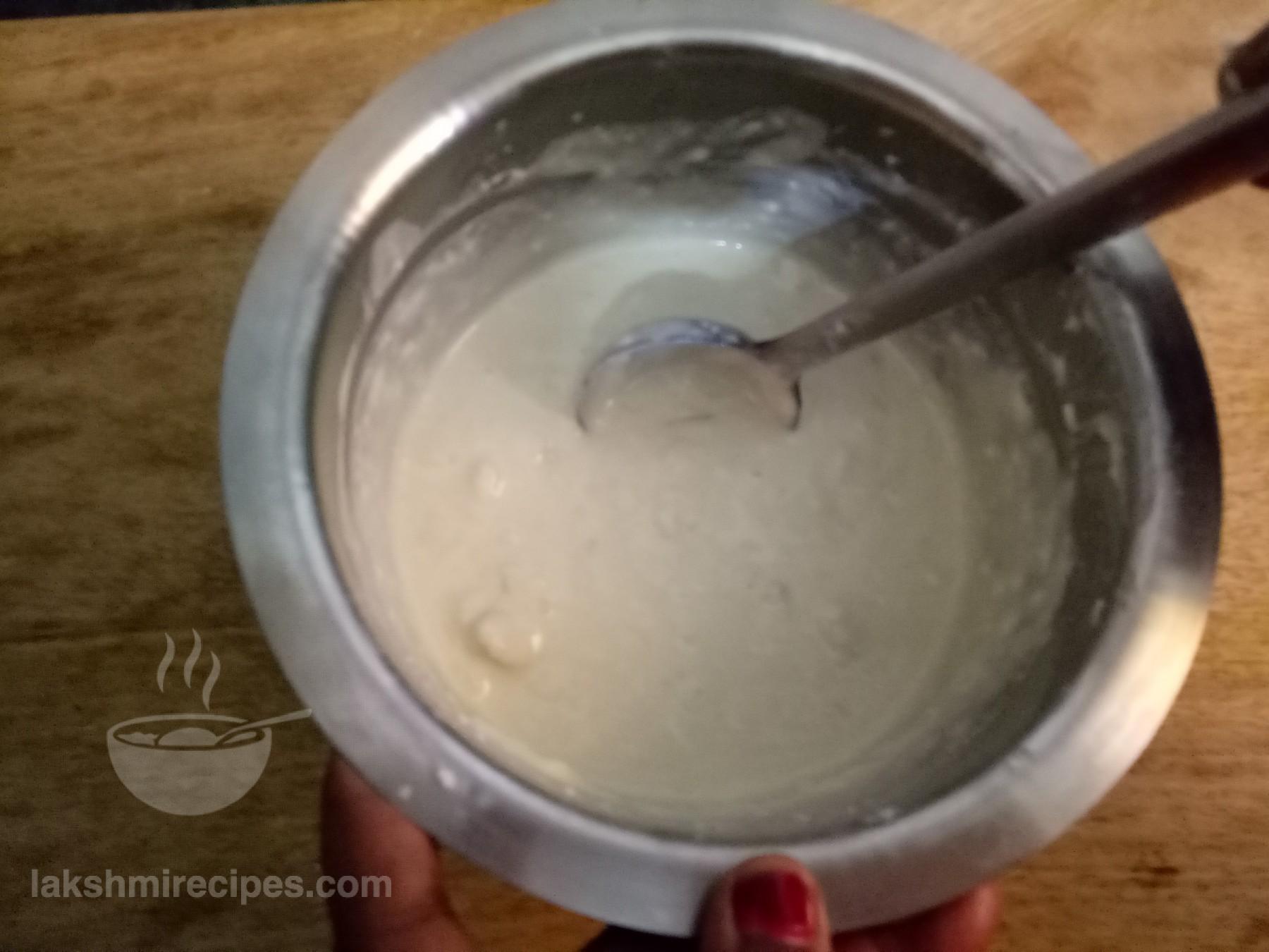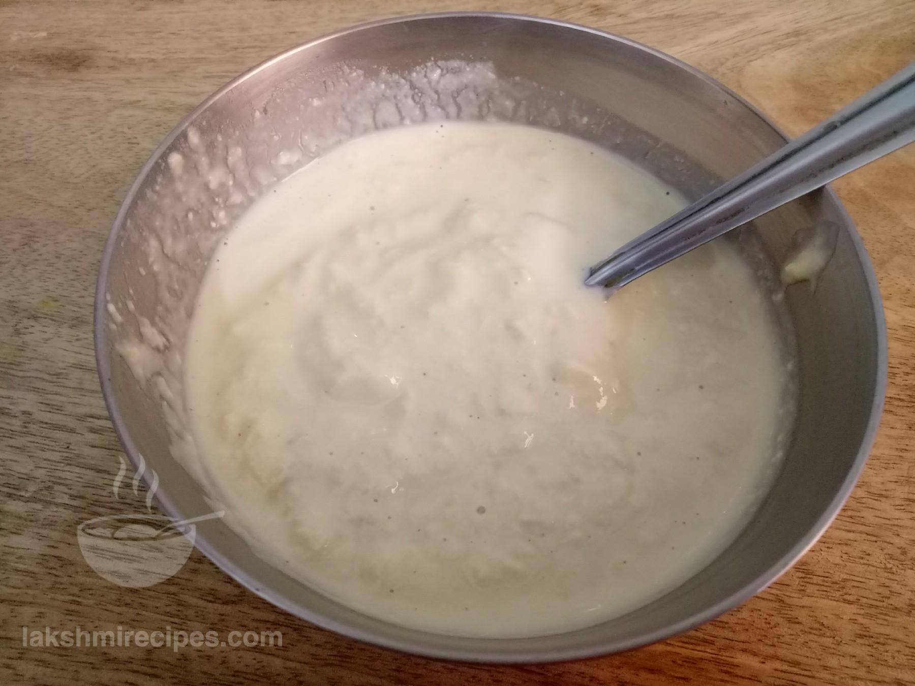 - Then add a little more milk and keep mixing to prepare a uniform batter of medium thick consistency. Add the milk slowly and mix continuously as you add milk to avoid any lump formation. The consistency of the batter should be enough so that it can be poured easily with a serving spoon or round ladle.