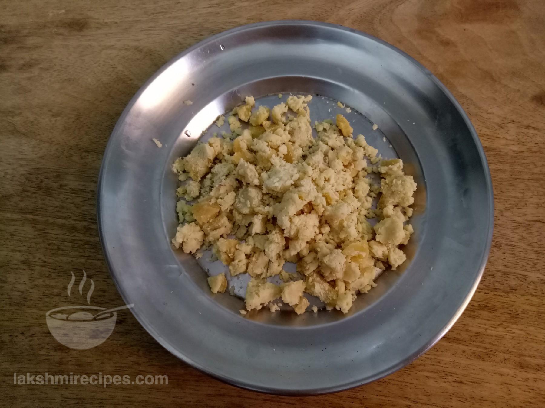 - Then crumble the khoya (mawa) a little and add it to the mixing bowl.