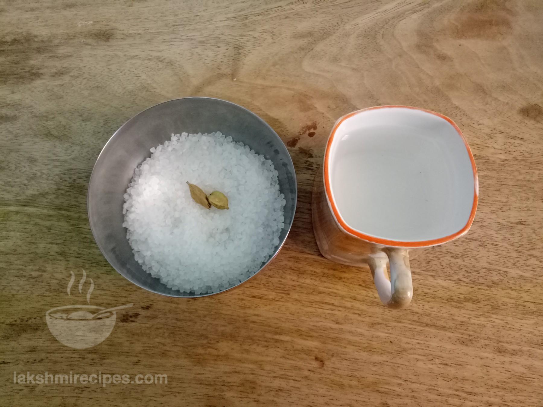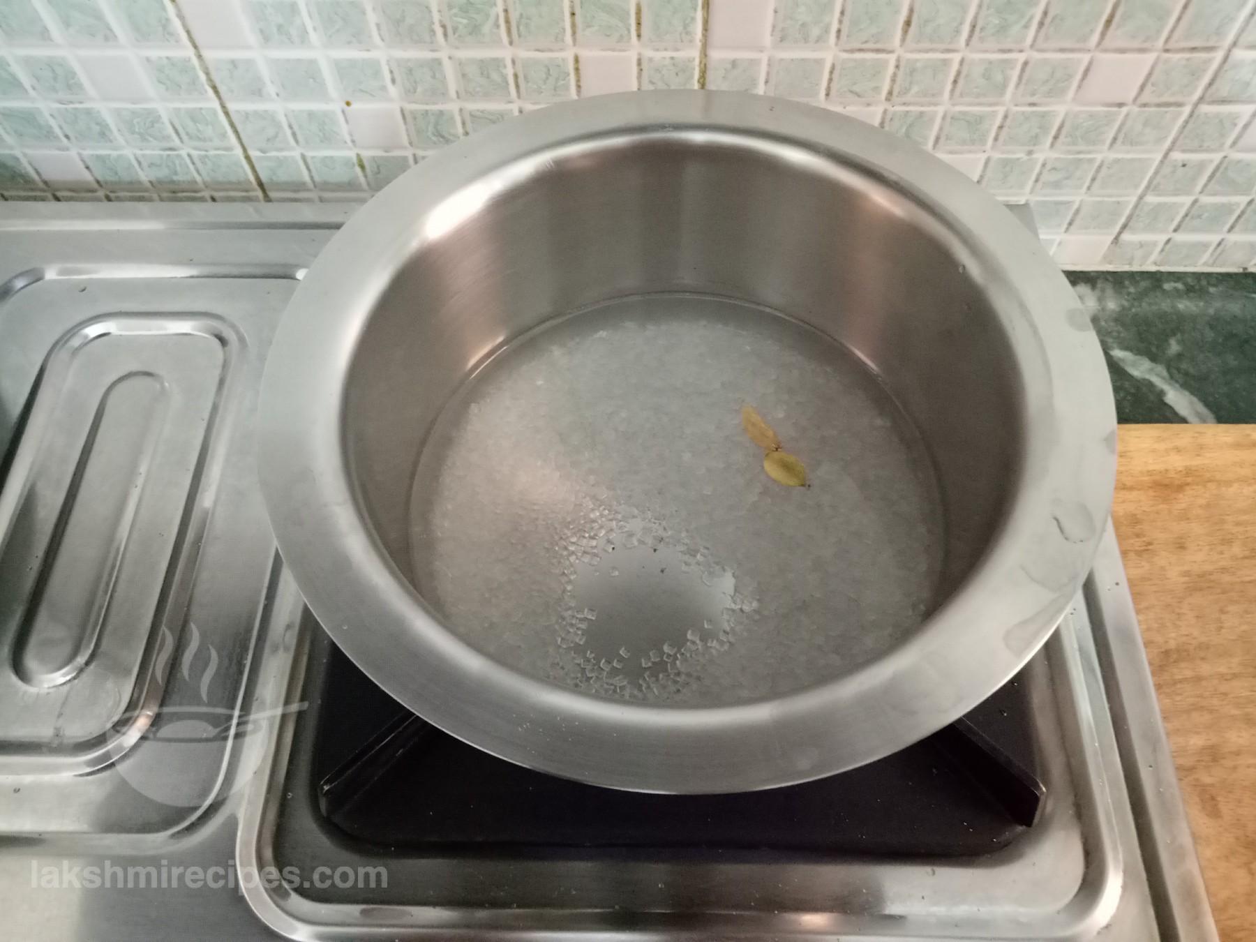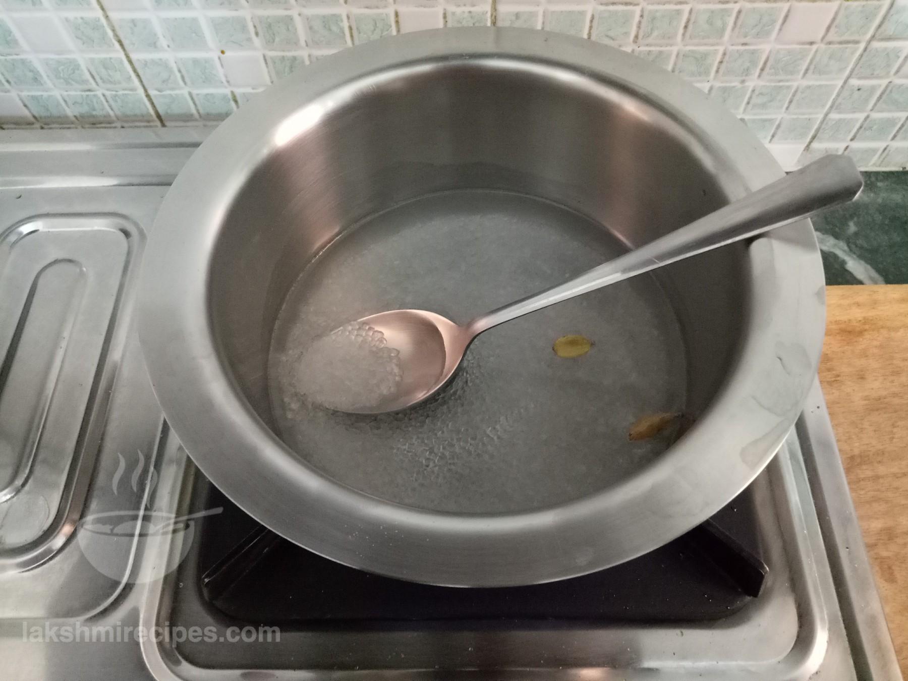 - Take sugar (cheeni), water (pani) and cardomom (chhoti elaichi) in a deep vessel (bhagona or pateela) and set the mixture to boil.