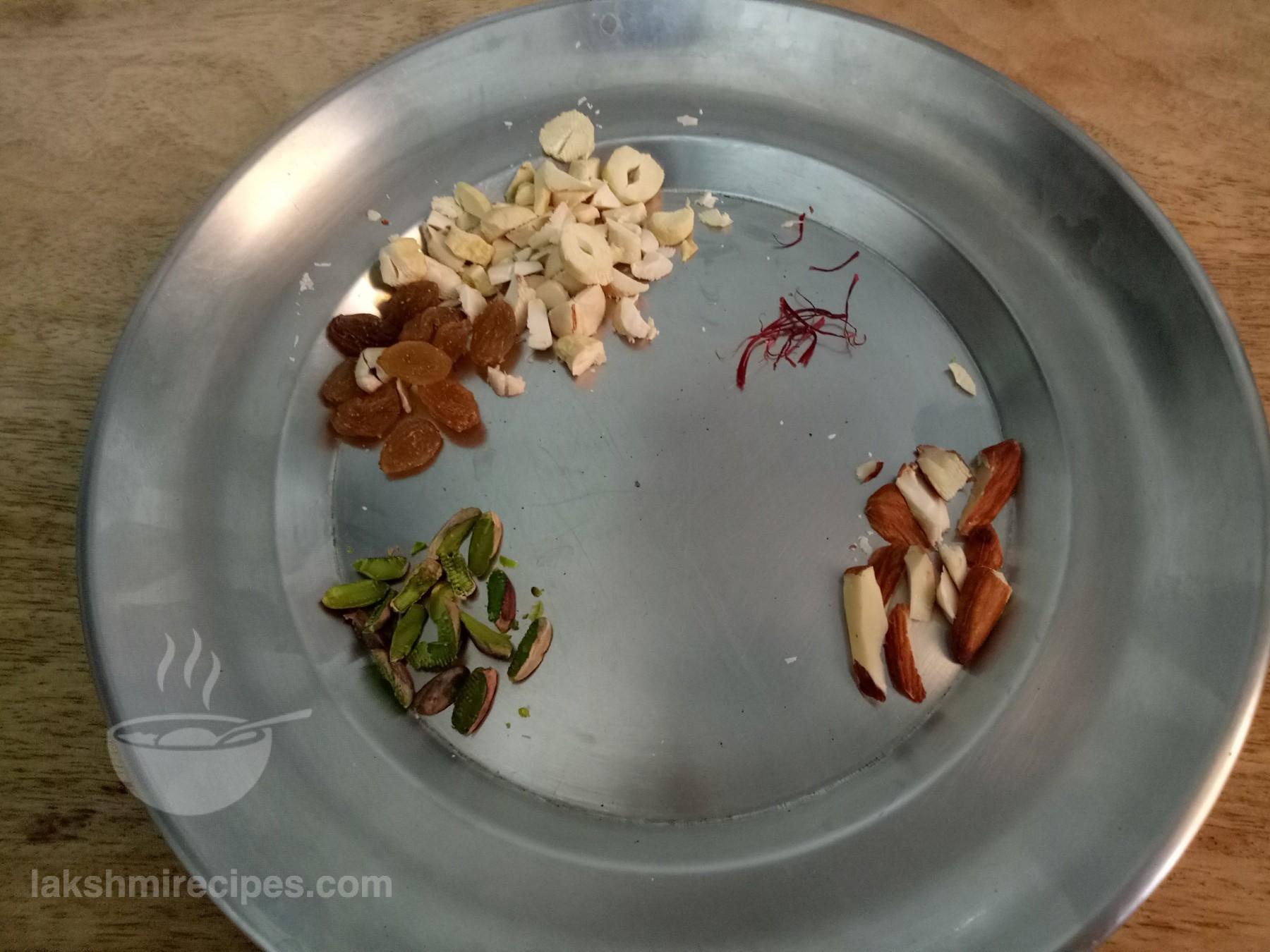 - In a deep mixing bowl take all pupose flour (maida), raisins (kismis) and chopped nuts (kaju, badaam, pista).