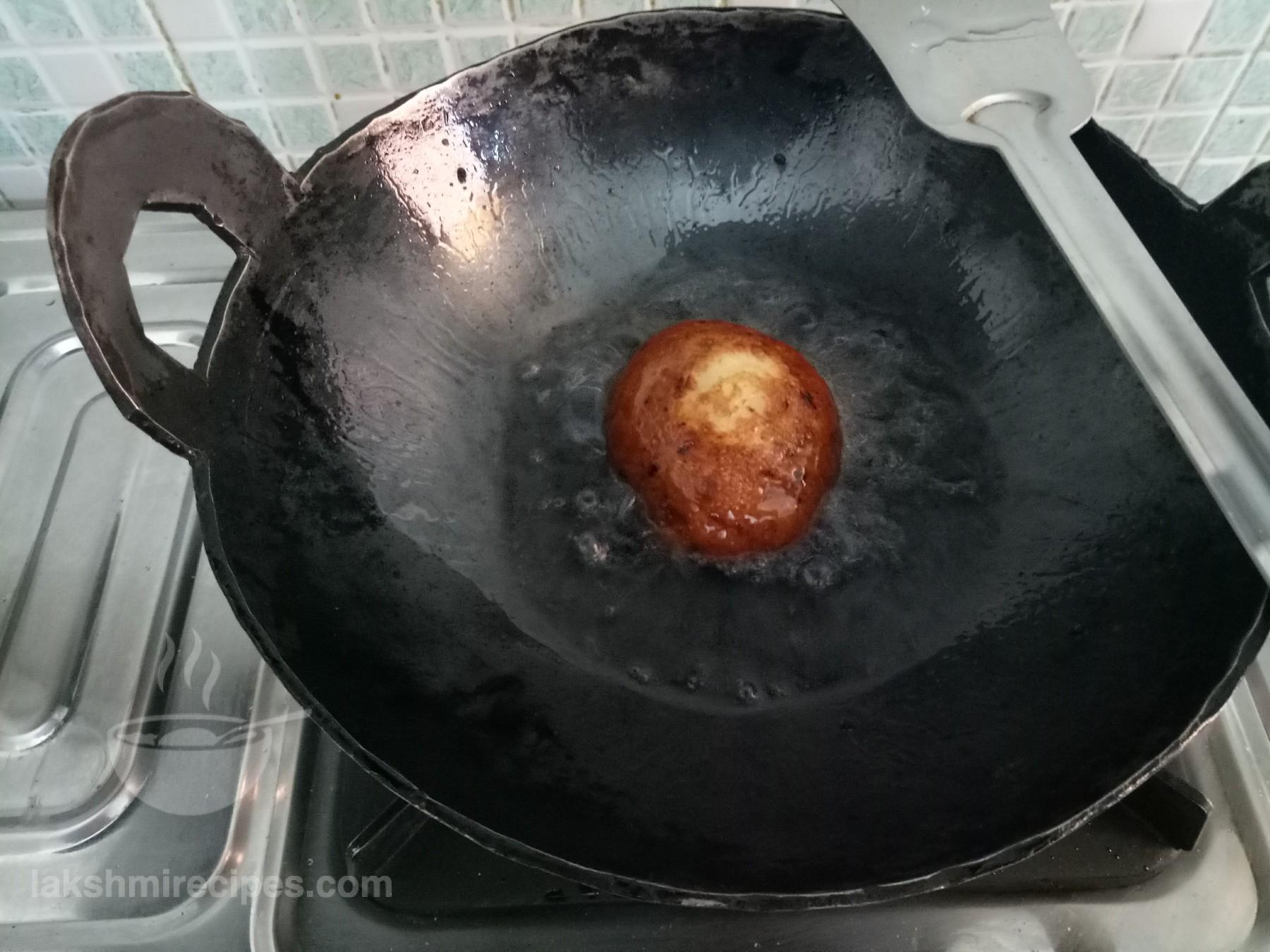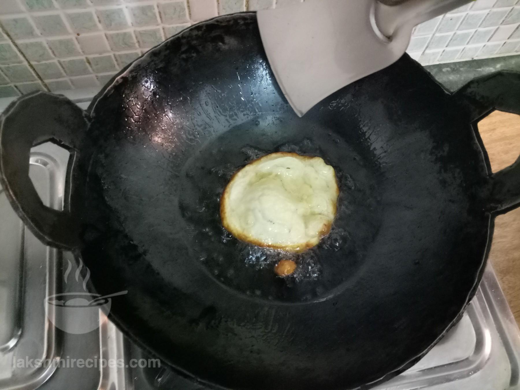 - Heat the oil or ghee in a kadhai over high flame. Lower the flame when the ghee is completely heated. With a serving spoon or round ladle pour batter in the form of small flat and round cutlet in the kadhai for deep frying. They should be fried on medium flame. (Before starting to fry the pua, check the consistency of the batter. If it is too thick, round dumpling or laddus will be formed. In that case add milk (doodh) to bring it to medium thick consistency. If it is too flowy or thin add some all purpose flour (maida) and mix well to bring it to medium thick consistency)