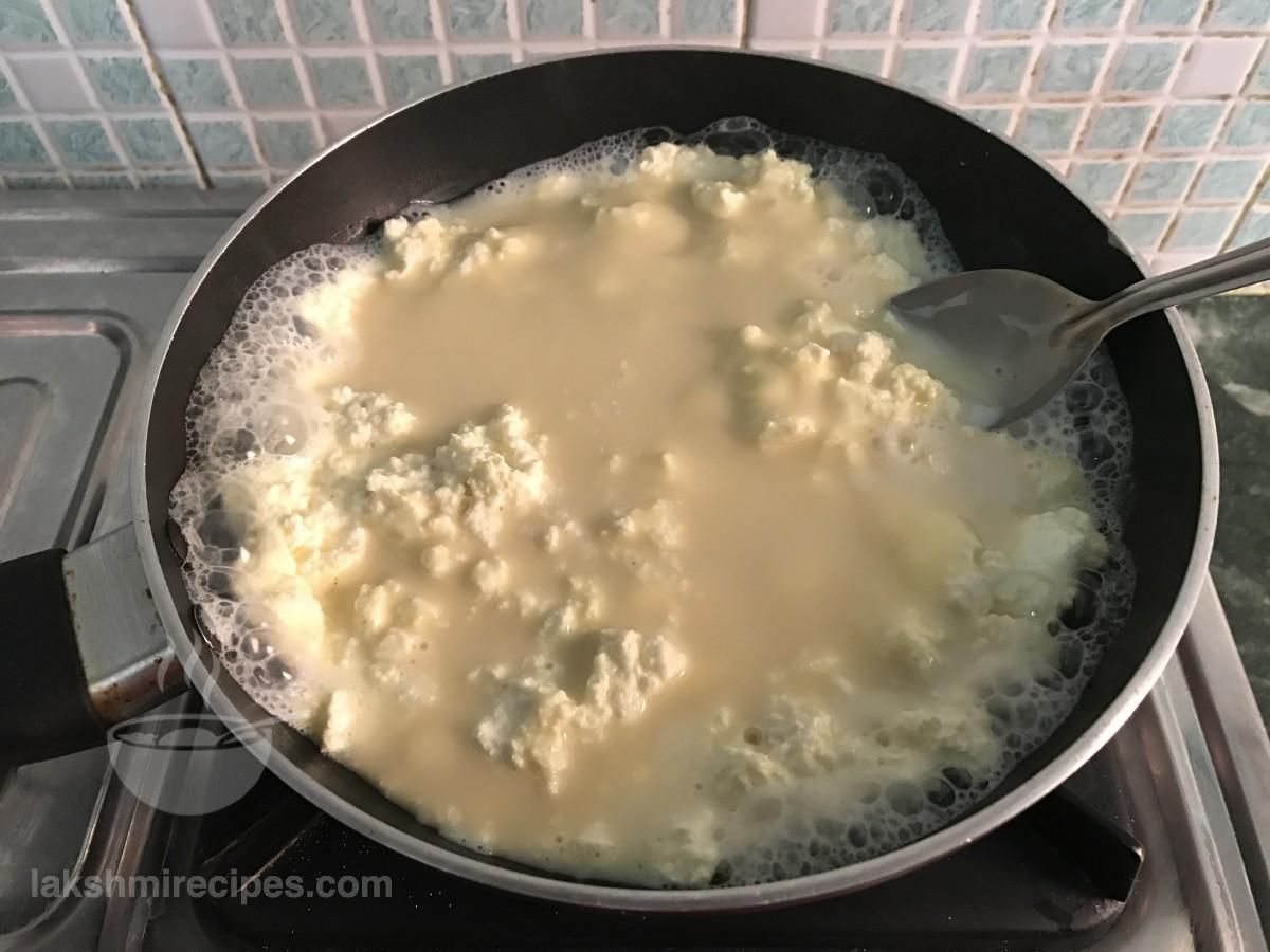 - After stirring the chhena for 2 minutes add the condensed milk to the pan and stir continuously to mix the two ingredients.