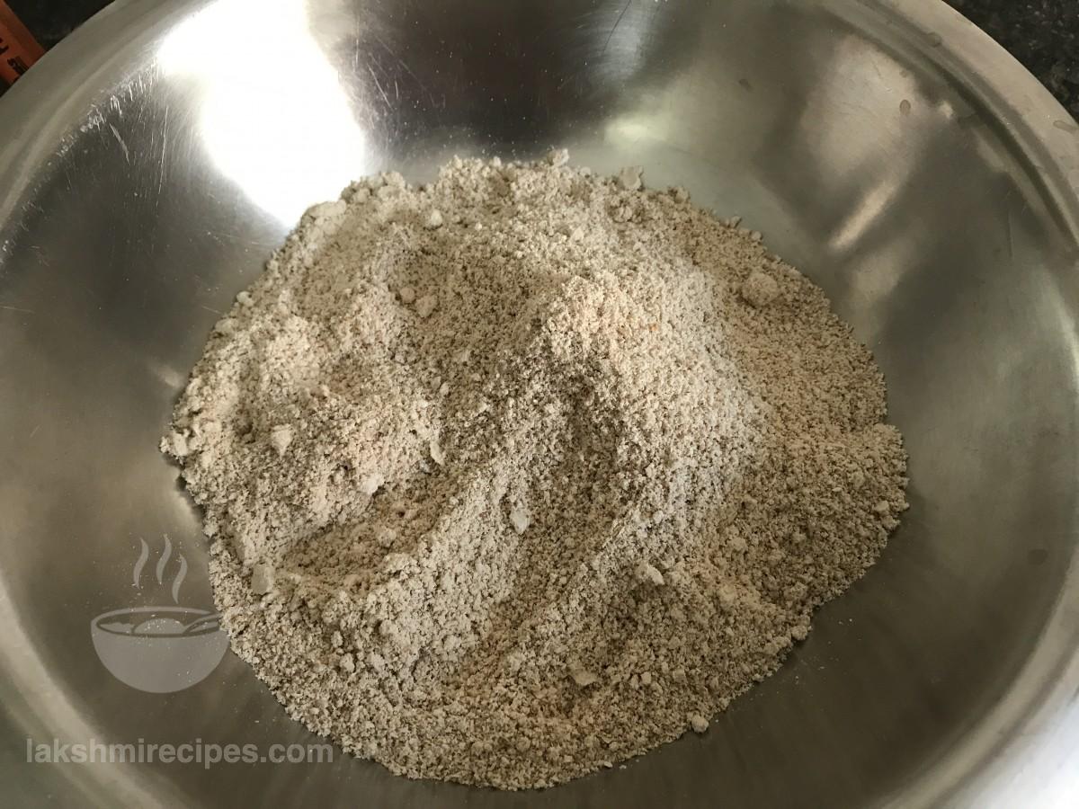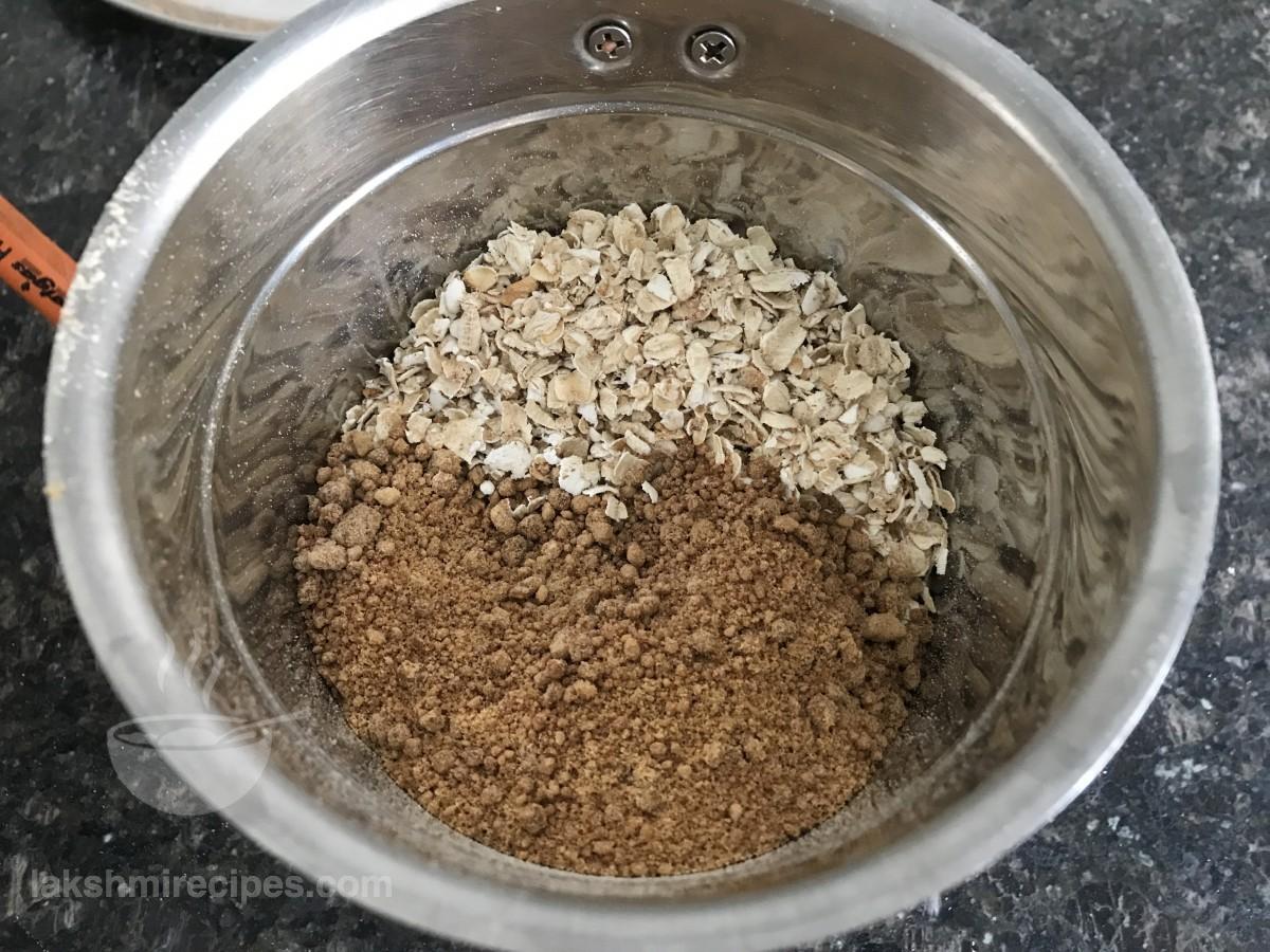 - Add jaggery pieces to the mixer jar and grind the 2 ingredients together. You can grind the ingredients to form a fine powder like texture or you can grind it lightly to retain a slight coarse texture of the oats. The light coarse texture will give the laddu slight crispiness.