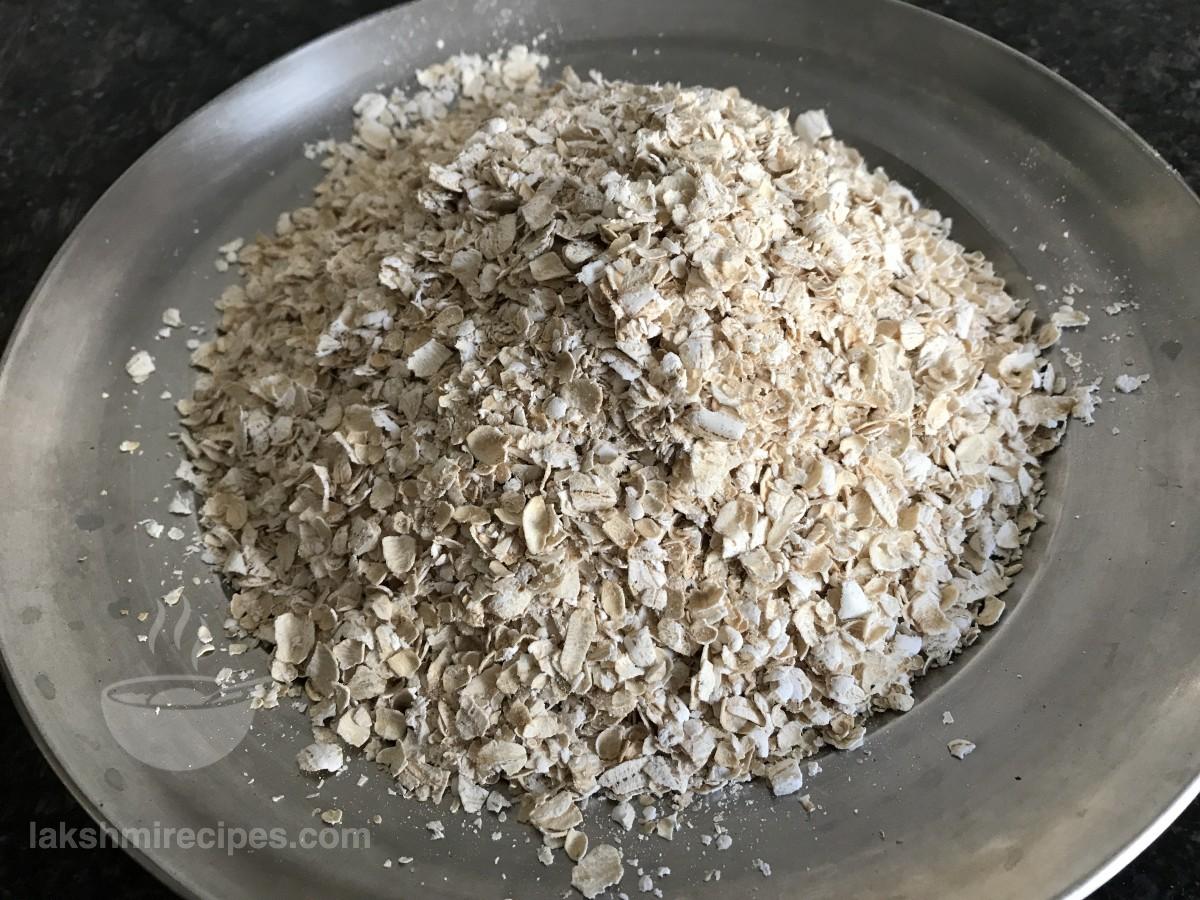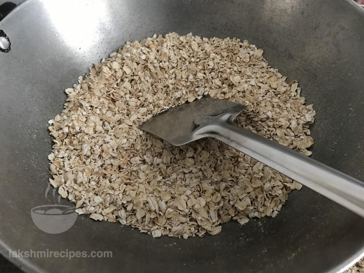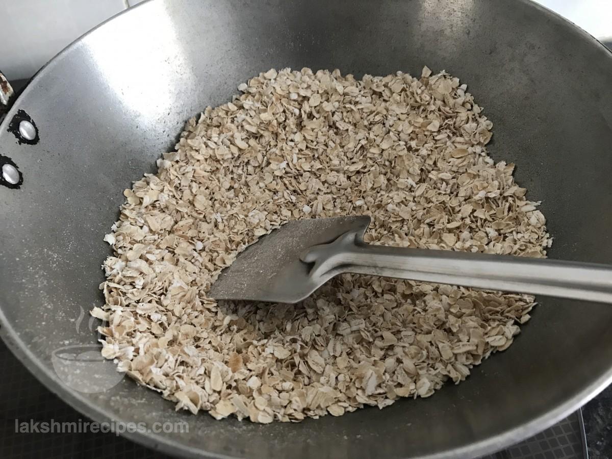 - Heat a big and thick based kadhai and add oats to it. Lower the flame to medium level and dry roast the oats until they turn reddish brown in color. Do not over-roast the oats, otherwise they may turn black in color. then turn off the flame.