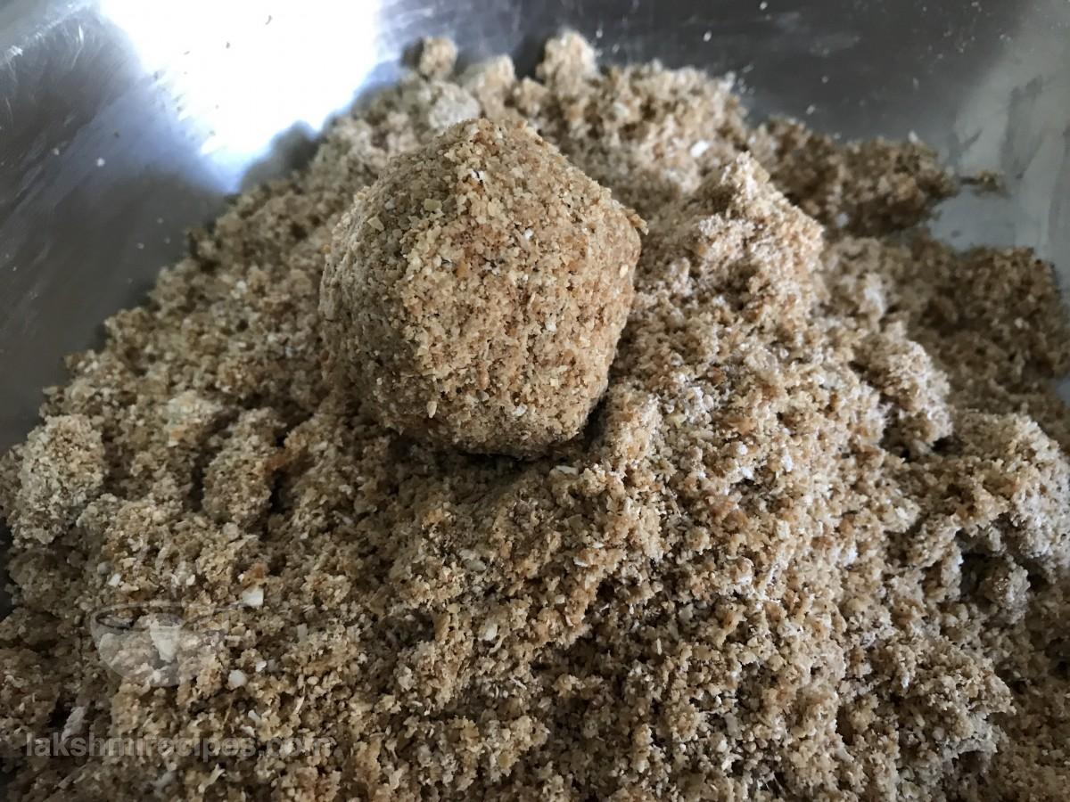 - Mix the ingredients and stop adding ghee when the mixture begins to bind. Start binding the mixture into a laddu of a desired size. Prepare laddus of the remaining mixture in the same way. The tasty, healthy and filling oats laddus are now ready to be served.