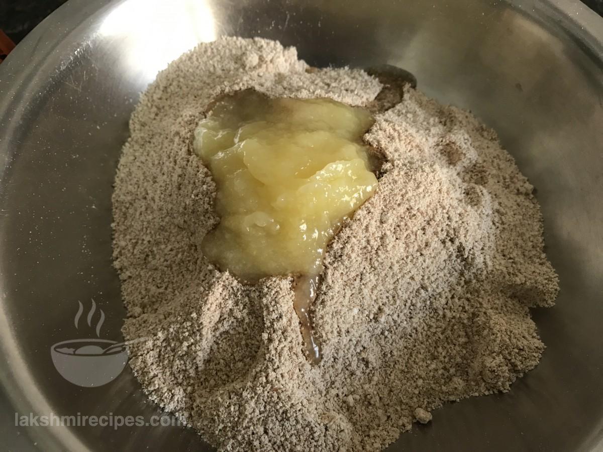 - पिसे हुए ओट्स या जई और गुड़ के मिश्रण को एक प्लेट में निकालें और इसमें धीरे-धीरे घी डालना शुरू करें।
