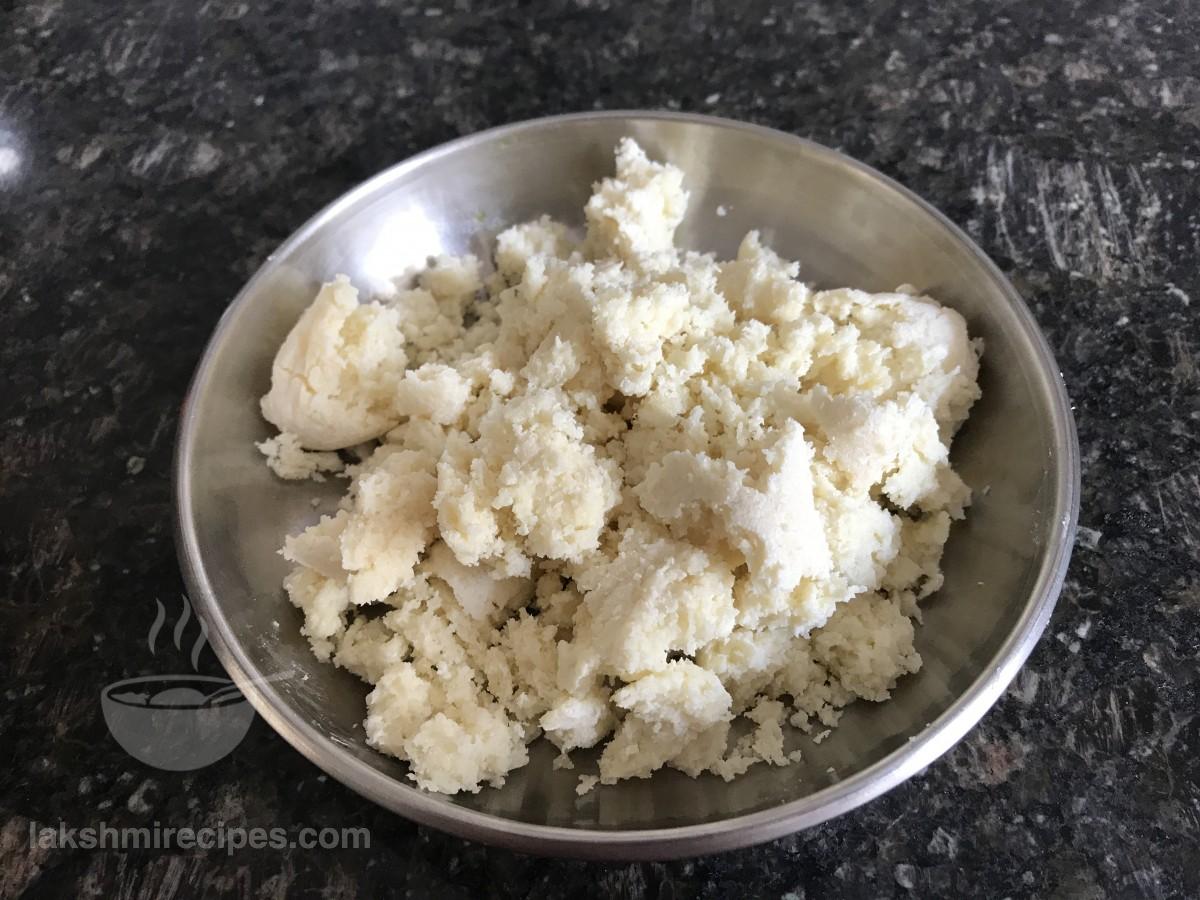 - अब छेना या पनीर को एक प्लेट में एक टुकड़े के रूप में निकालें। छेना या पनीर को अपने हाथों से छोटे टुकड़ों में तोड़ कर भुभुरा कर दें (जैसा कि नीचे की छवि में दिखाया गया है)।