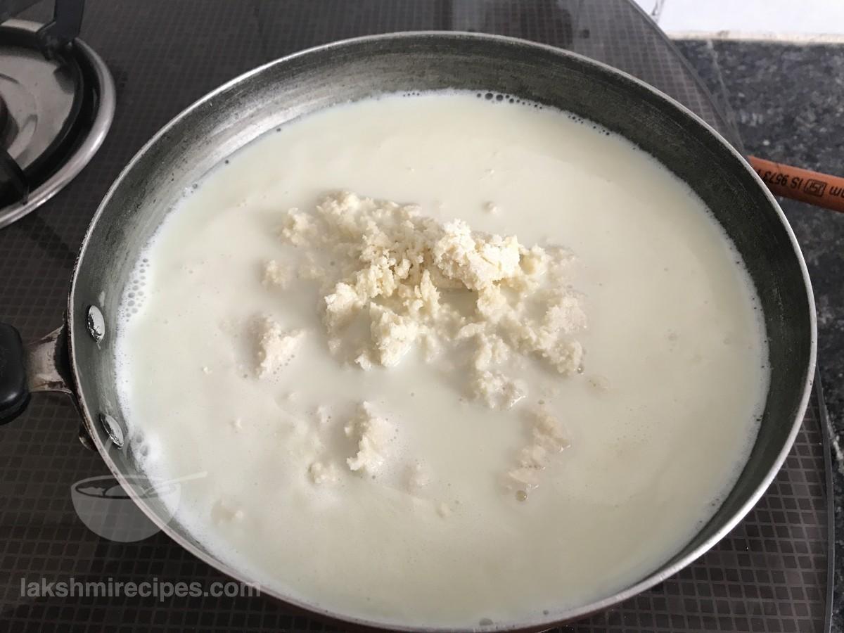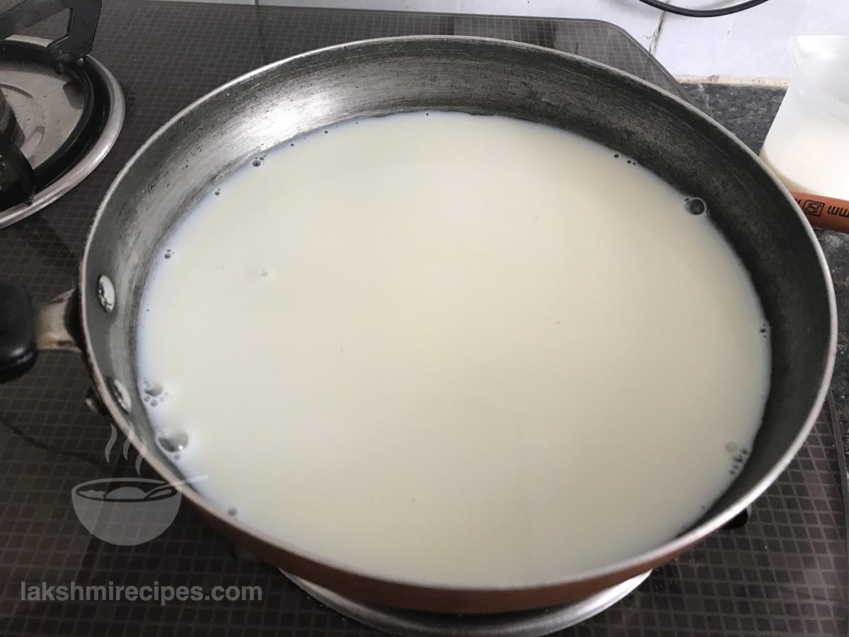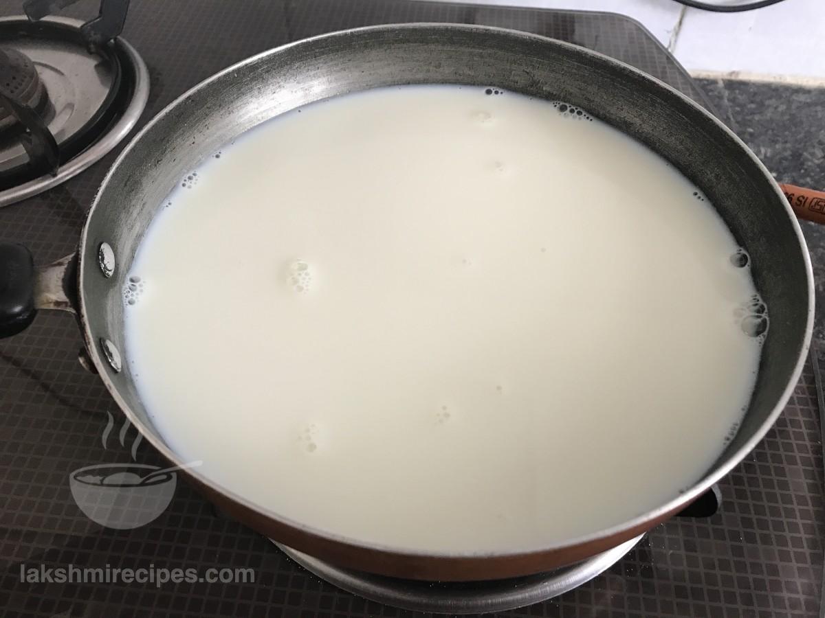 - फिर एक चौड़े पतीले में फुल क्रीम दूध डालें और इसे उबलने केलिए रख दें।