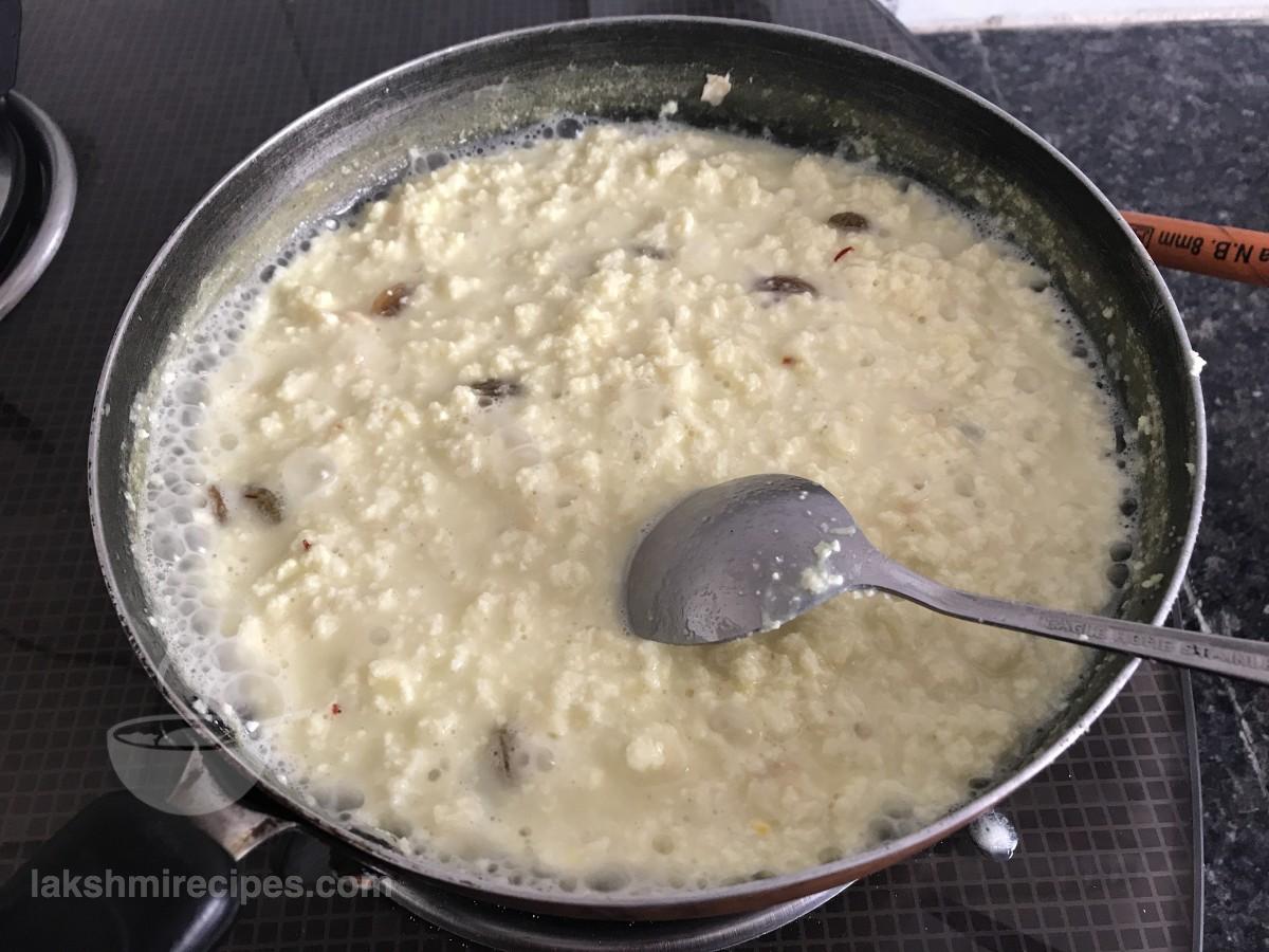 - अब छेना या पनीर को इस गाढ़ा किये हुए दूध में डालें और सिर्फ 5 मिनट के लिए सामग्री को एक साथ चलाते हुए पकने दें। ध्यान रहे की दूध में छेना डालने से दूध फट सकता है, इसलिए छेना य पनीर को दूध में तब डालें जब वो अच्छे से गाढ़ा हो जाए और 5 मिनट तक ही सामग्री को एक अच्छे से मिलाते हुए पकाएं।