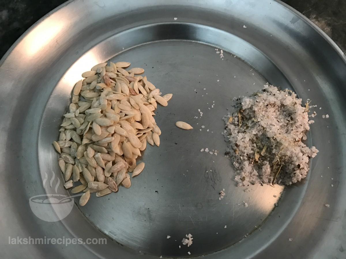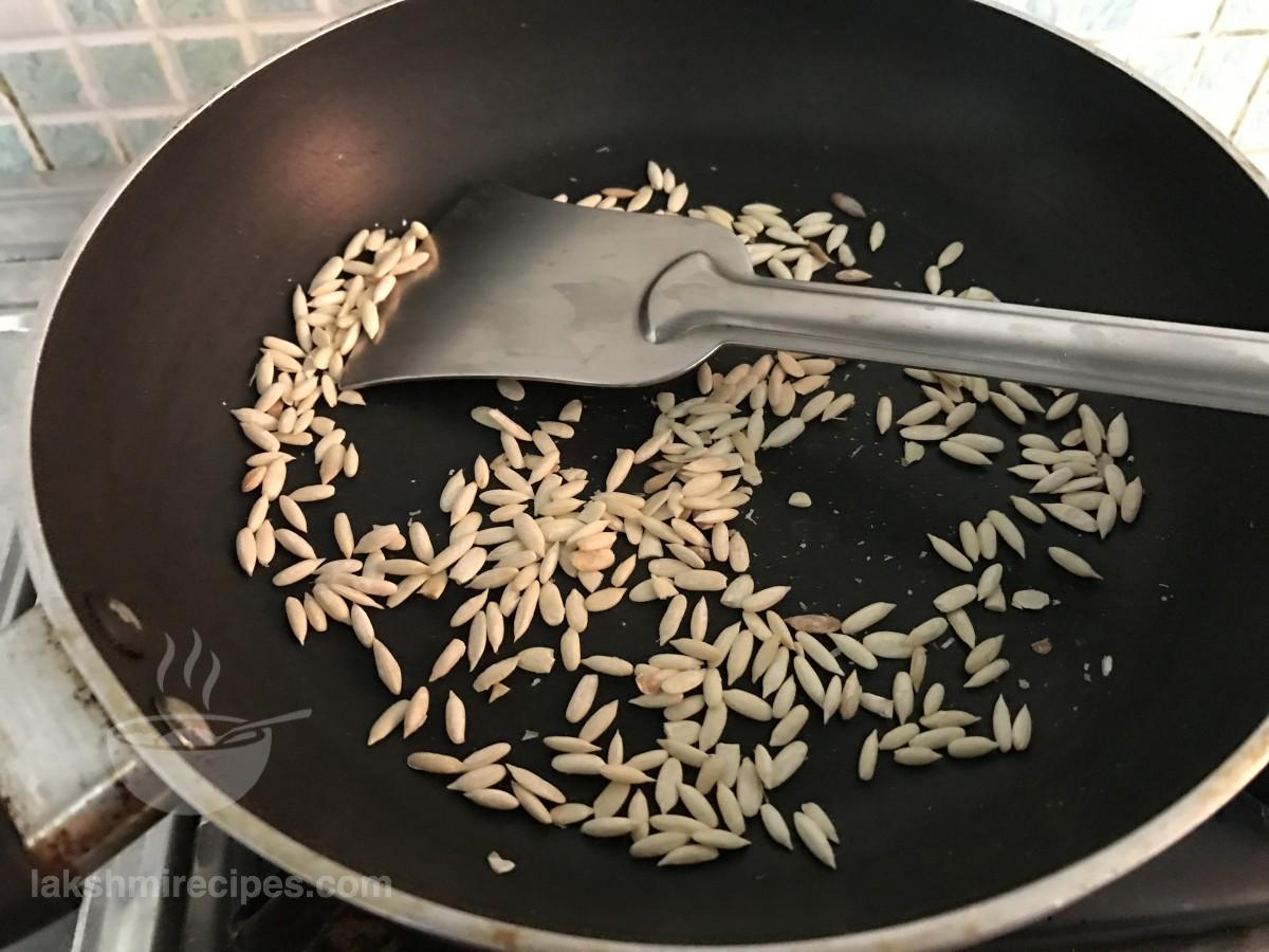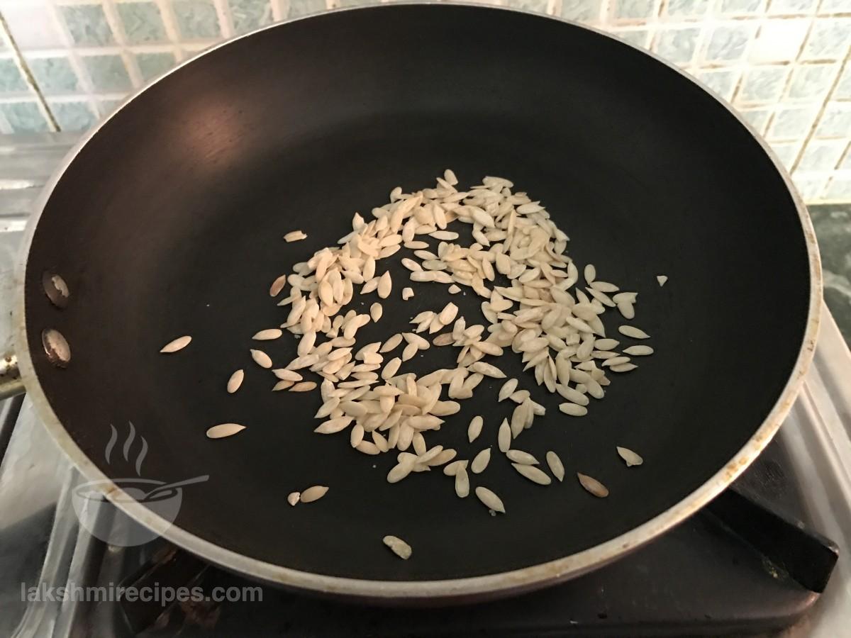 - Heat a non-stick pan and add muskmelon seeds to it. Dry roast the muskmelon seeds till you can feel its aroma.