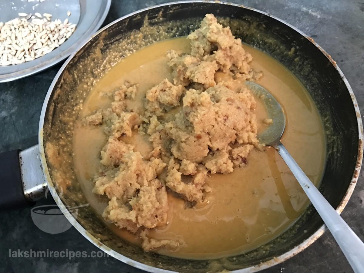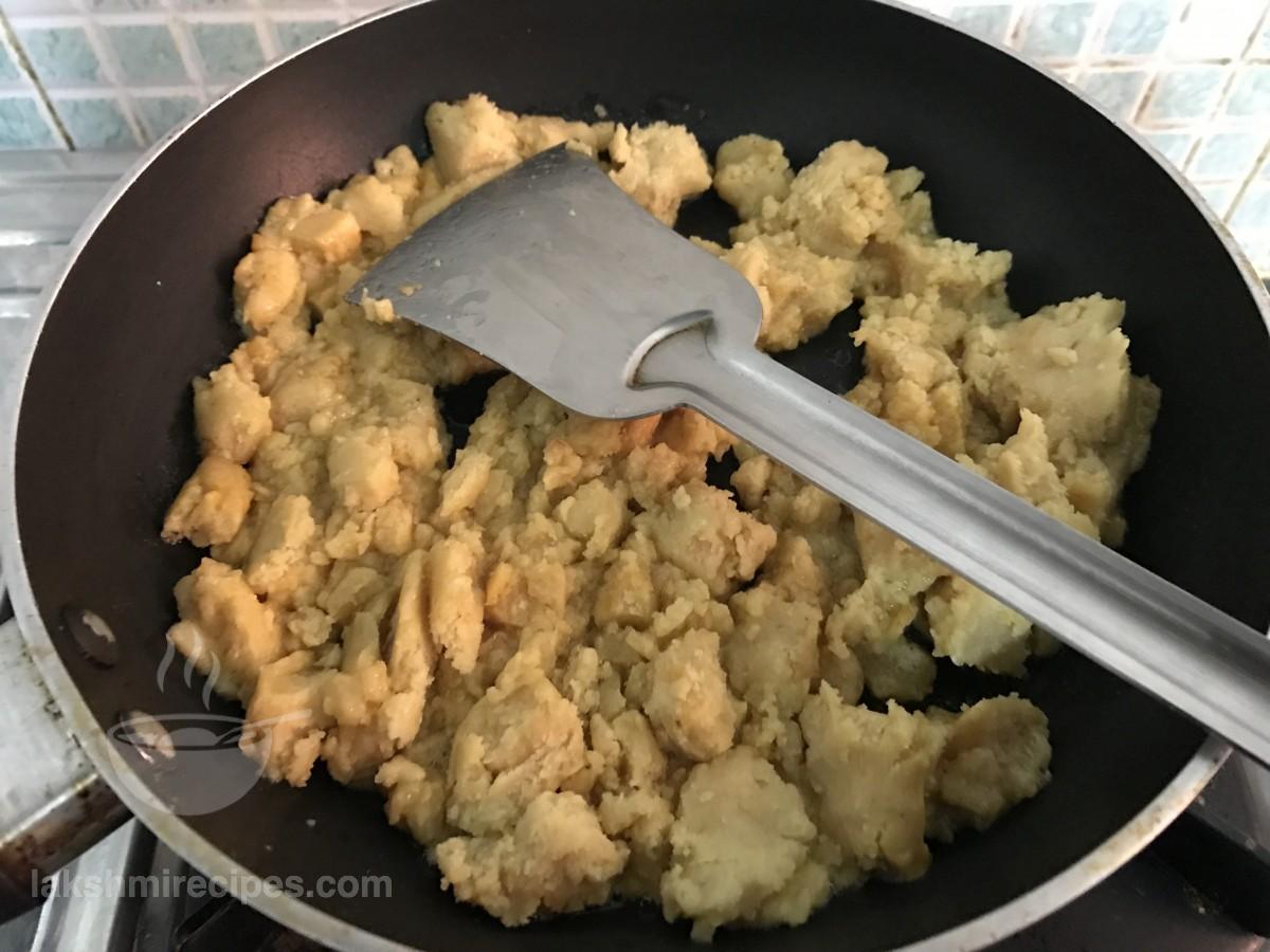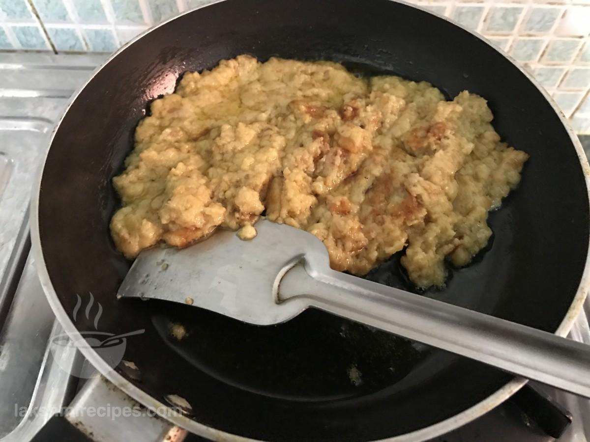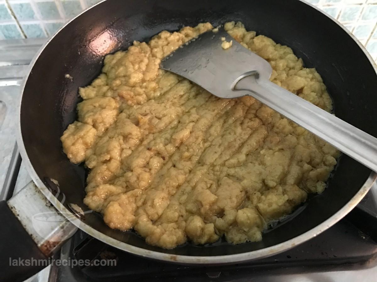 - Then add the preapred khoya to the roasted gram flour and mix well.