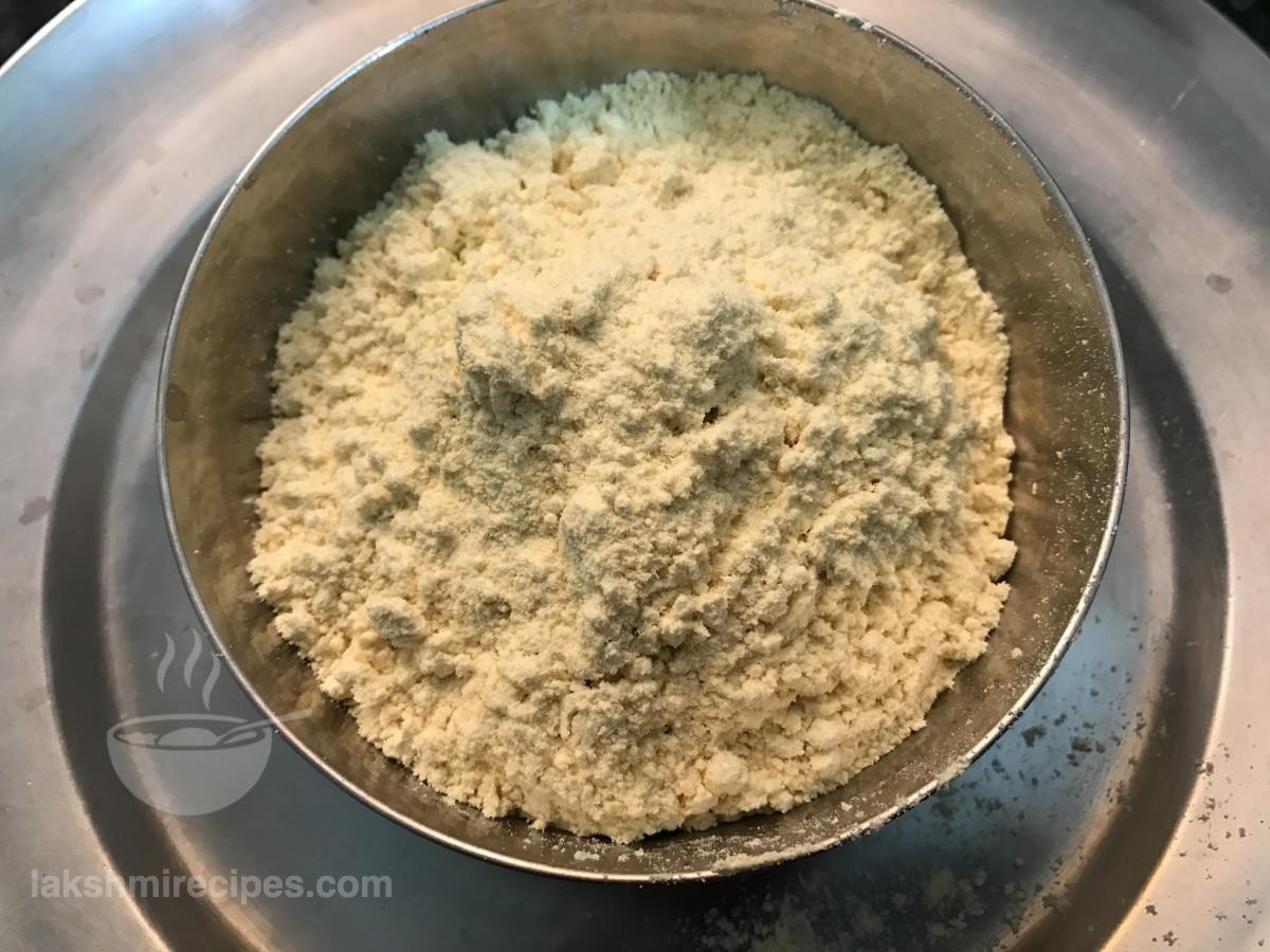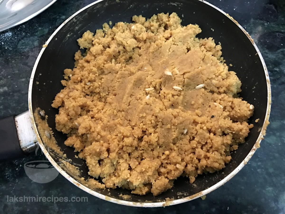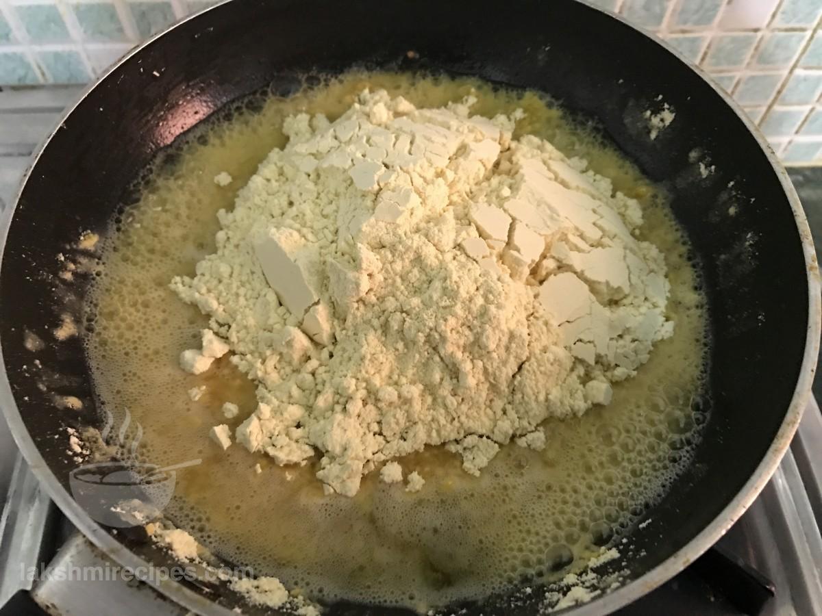 - Then heat 2 table spoon ghee in a non-stick pan and add 1 table spoon gram flour to it. Lower the flame to low level. Stir and roast the gram flour till it changes its color to light brown and you can feel its aroma.