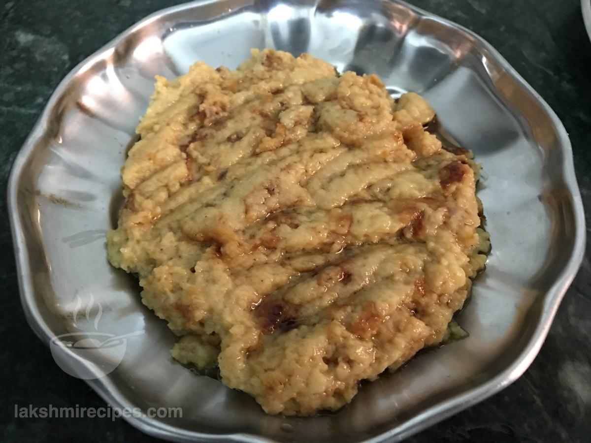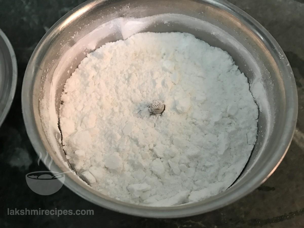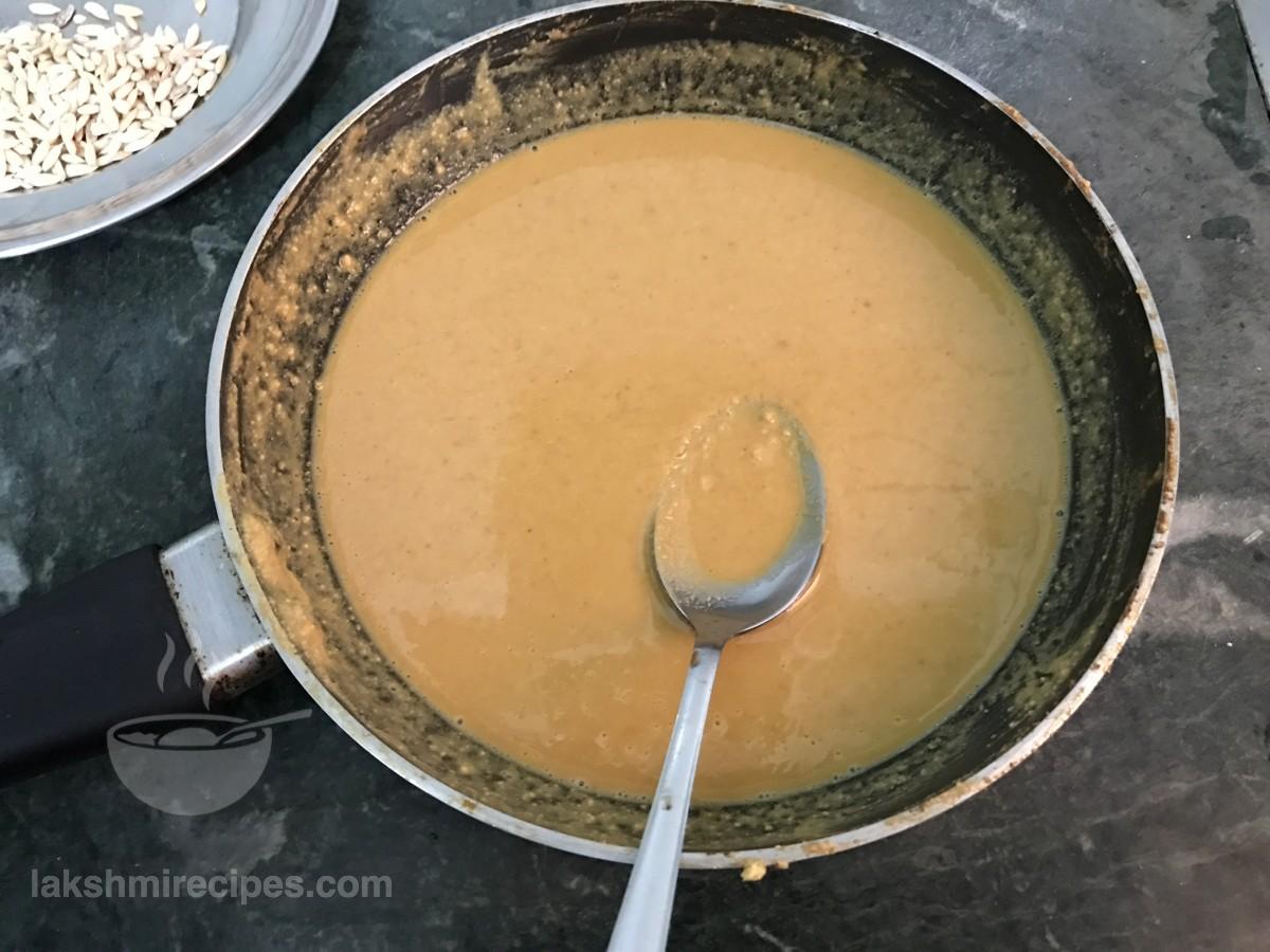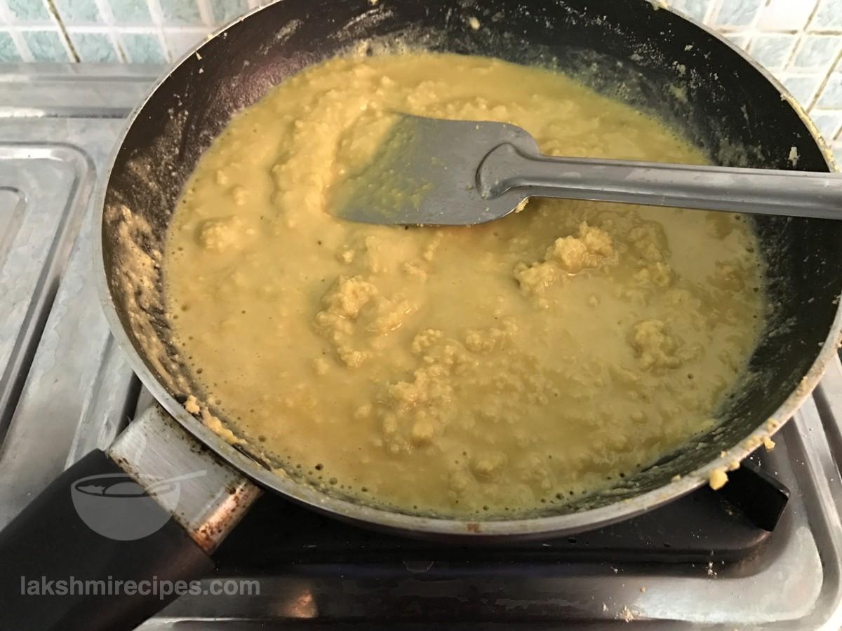 - Then heat 2 table spoon ghee in a non-stick pan and add 1 table spoon gram flour to it. Lower the flame to low level. Stir and roast the gram flour till it changes its color to light brown and you can feel its aroma.