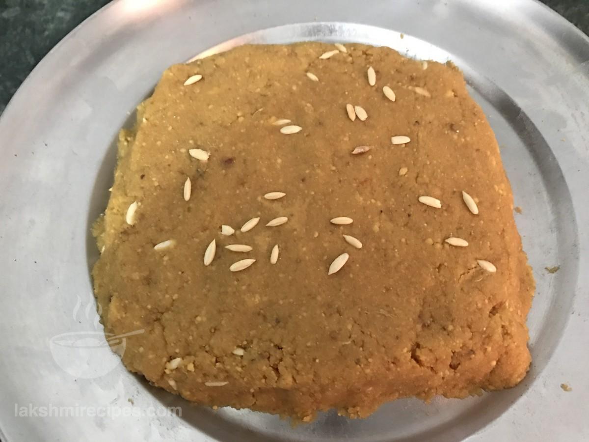- Transfer this mixture to a tray/mould/plate and spread into a uniform layer and cut into barfis of desired shapes. The "Besan aur Khoye Ki Barfis" are ready to be served.