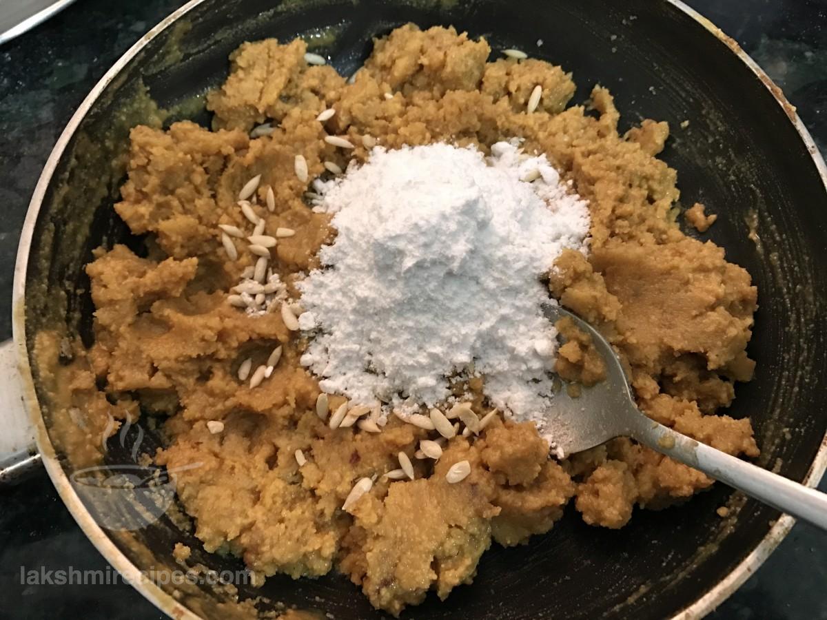 - Add muskmelon seeds and cardamom powder to this mixture and mix again.