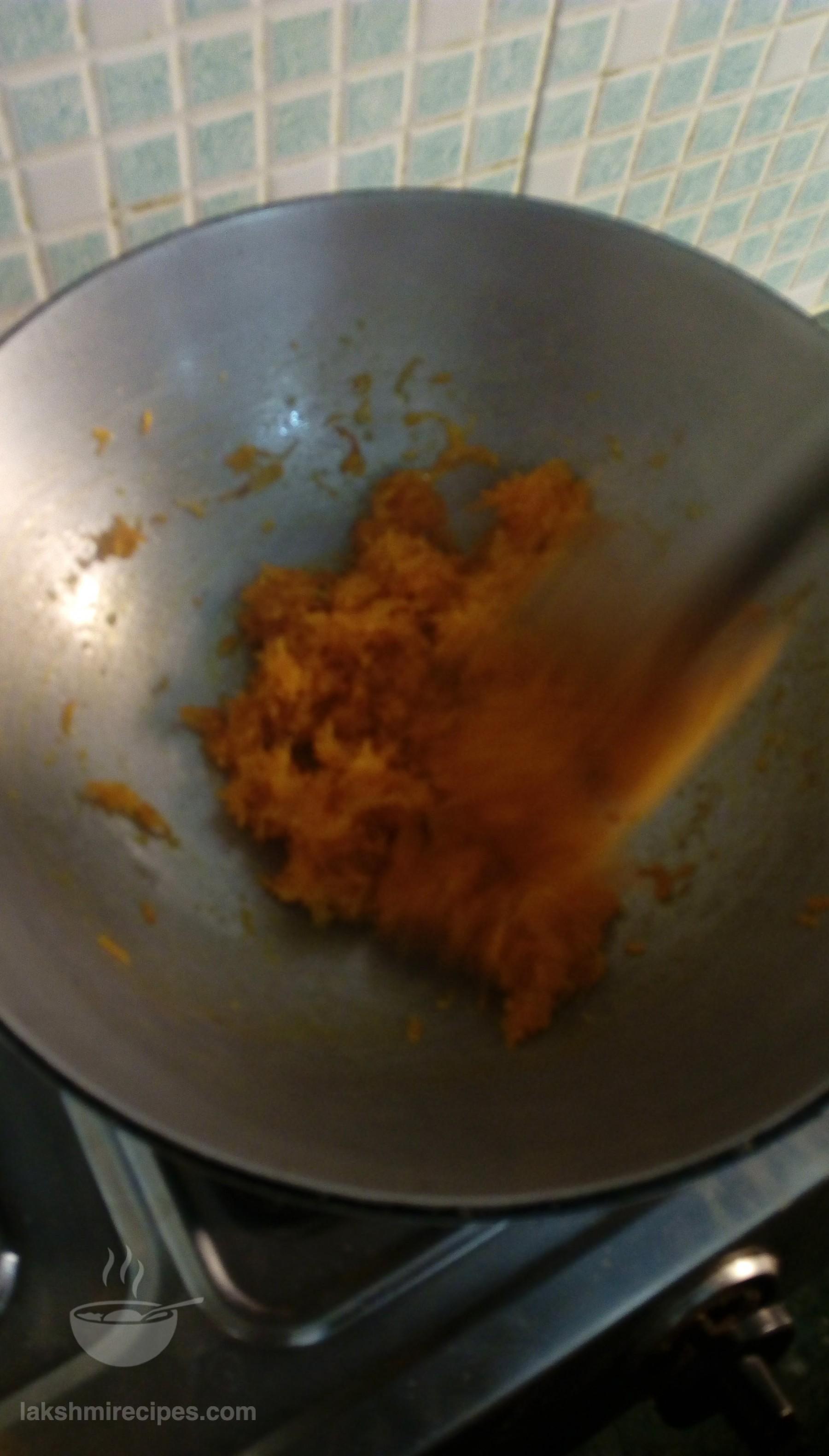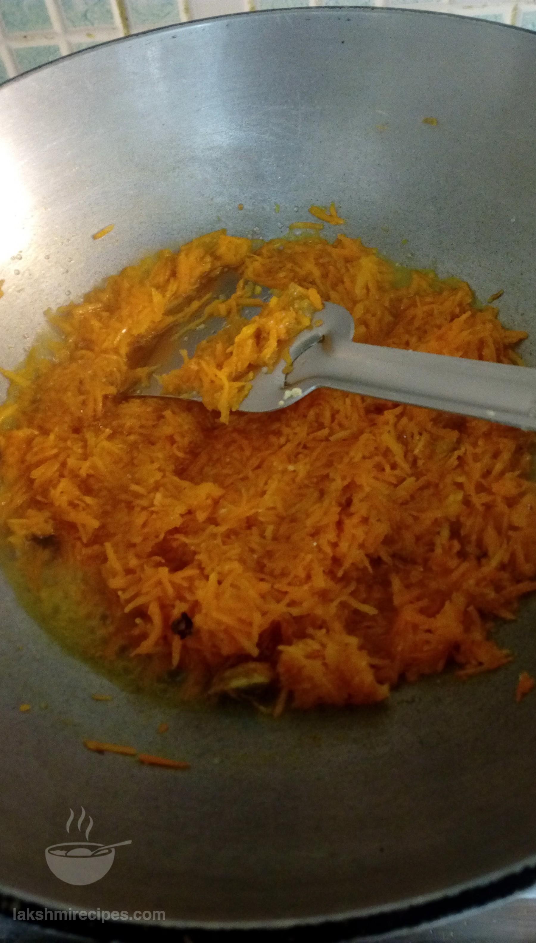 - The grated carrots (gajar) will get cooked in 10-15 minutes. Keep stirring as it cooks and cook till all the moisture is evaporated. (Kindly note there shouldn't be any moisture left in the halwa being prepared.)