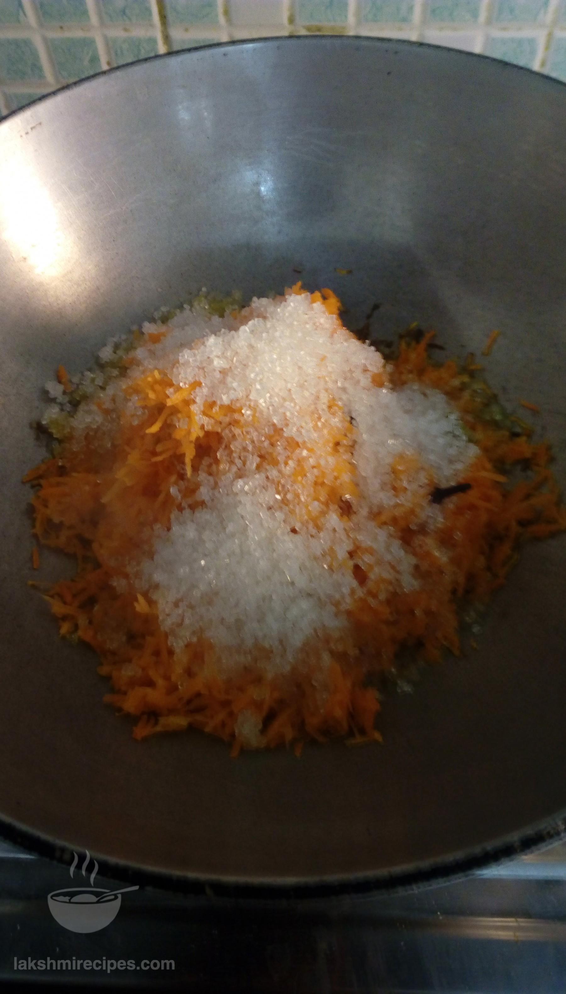 - Now heat 2 table spoon ghee in a kadhai. When the ghee is hot enough for cooking then add the grated carrot (gajar) followed by sugar to it.