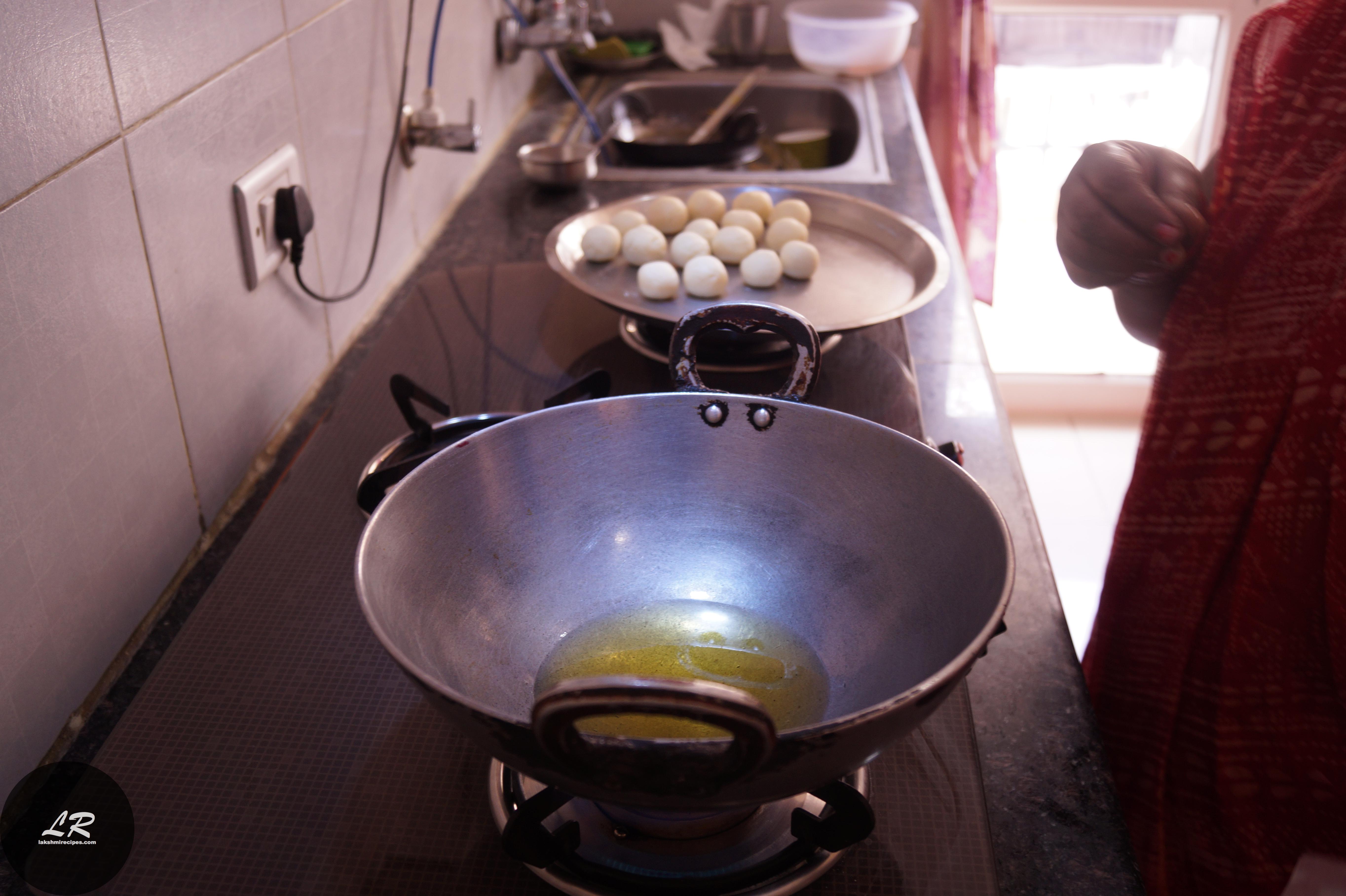 - Heat the refined oil in a deep kadhai on high flame. (take enough oil so that gulab jamun balls are completely submerged in the oil while frying)