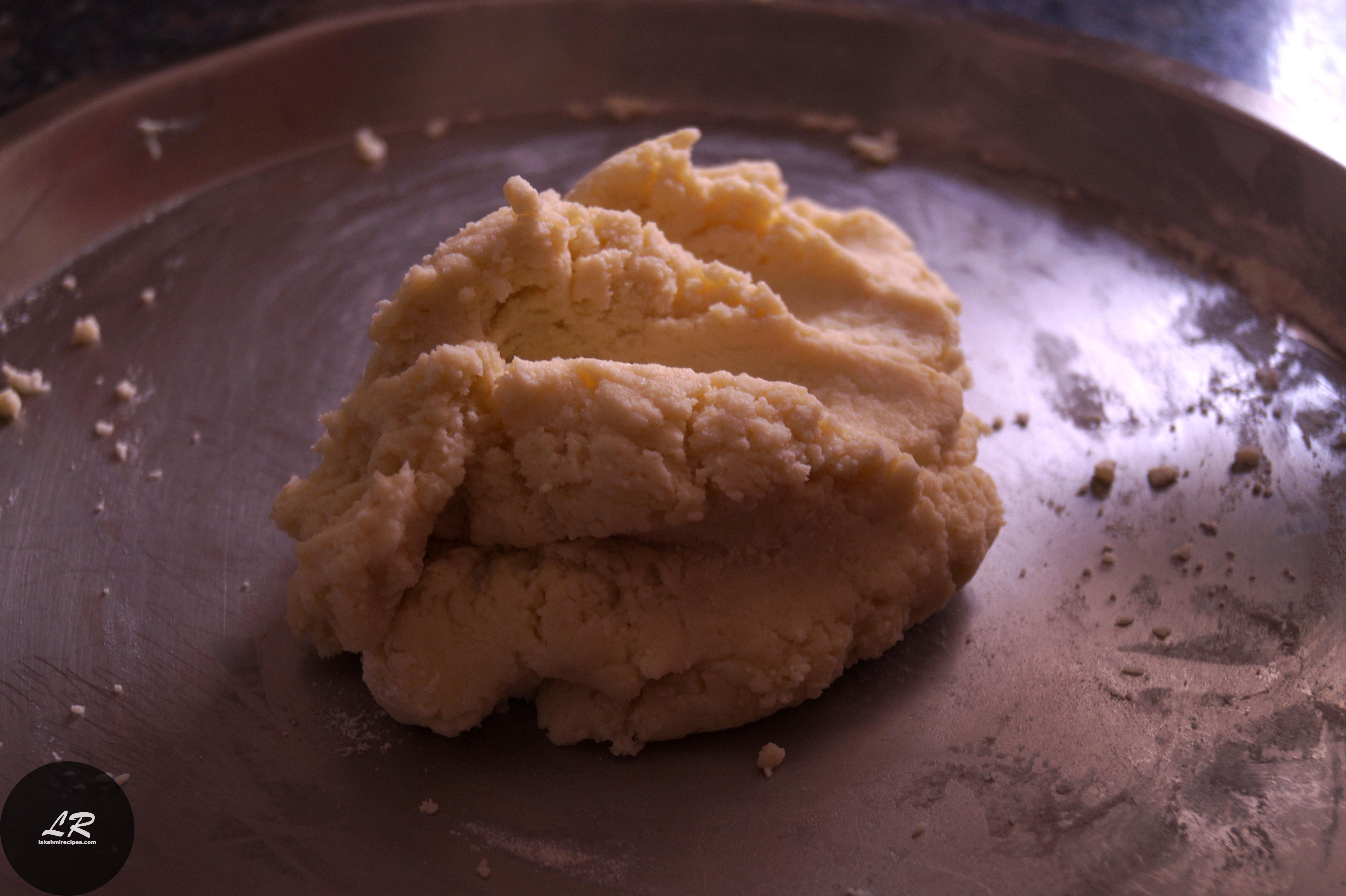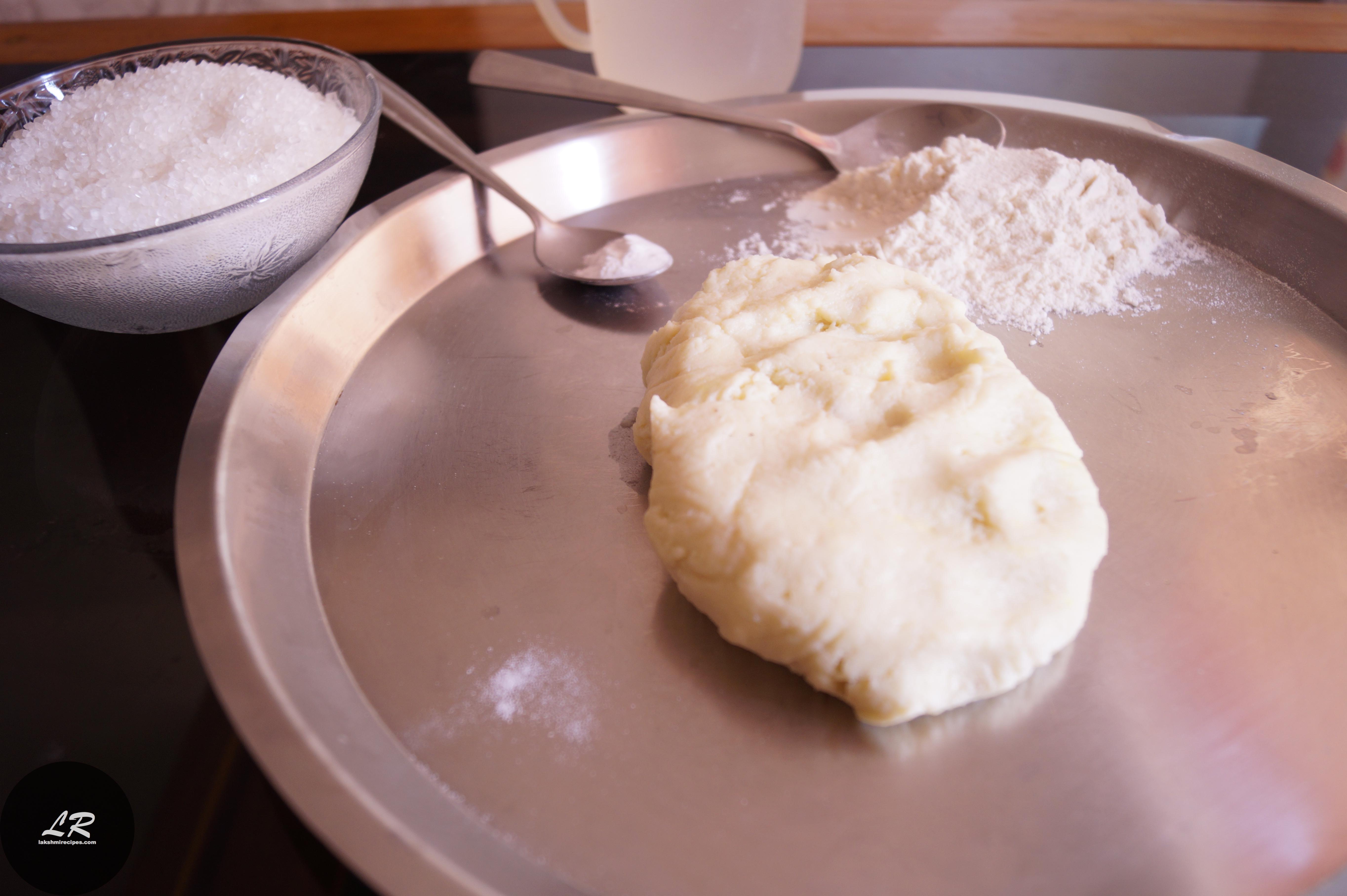 - In a flat plate take the khoya, all purpose flour and meetha soda. Mix well and smoothen it.