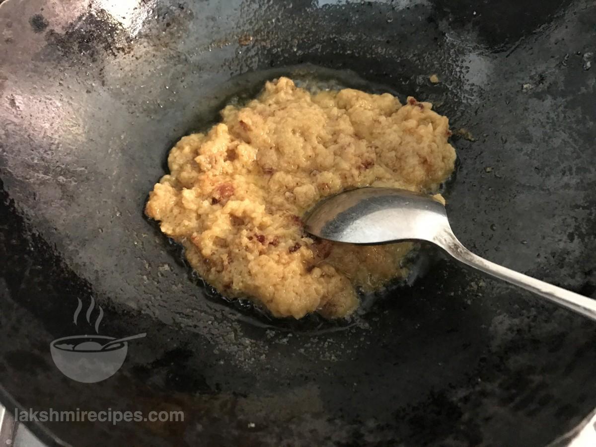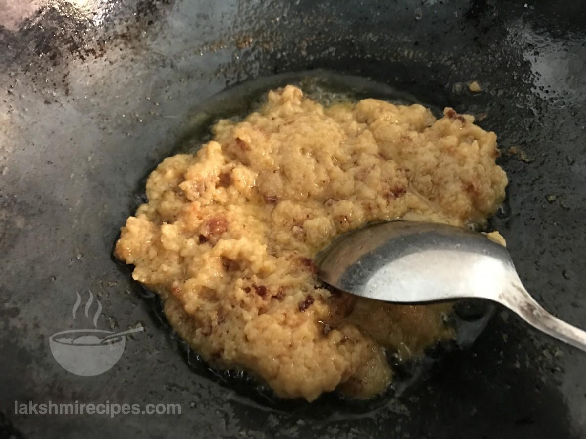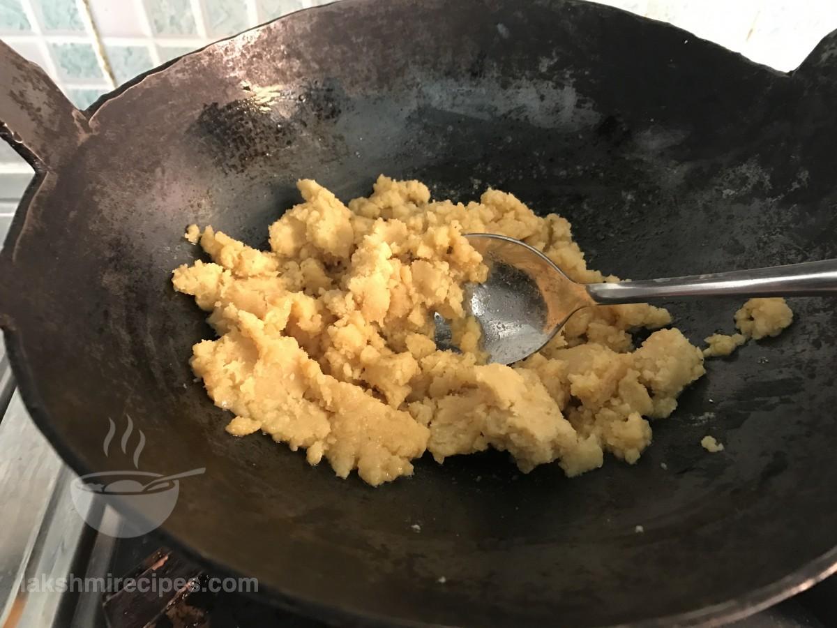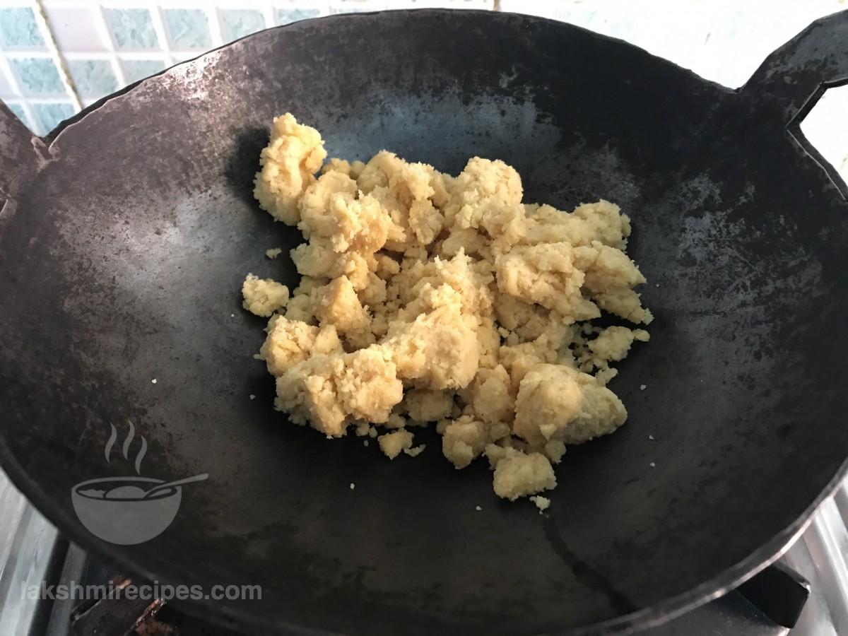 - Stir and cook the crumbled khoya till it attains a uniform light red colour.
