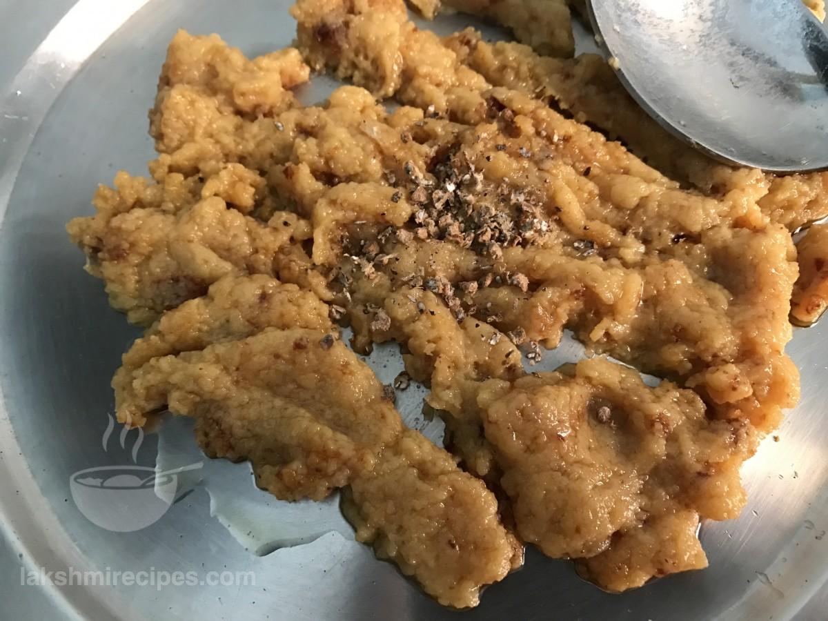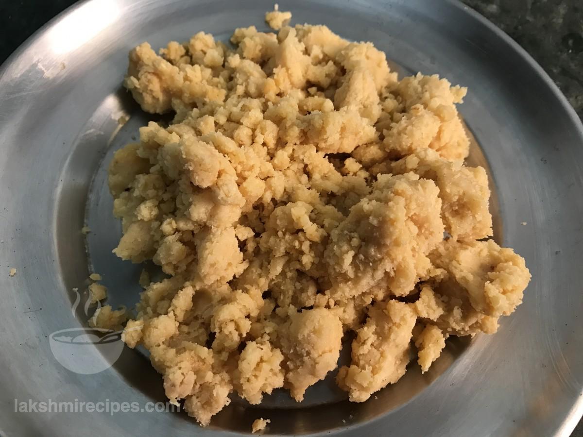 - Then transfer the cooked crumbled khoya to a plate and allow it to cool a little.