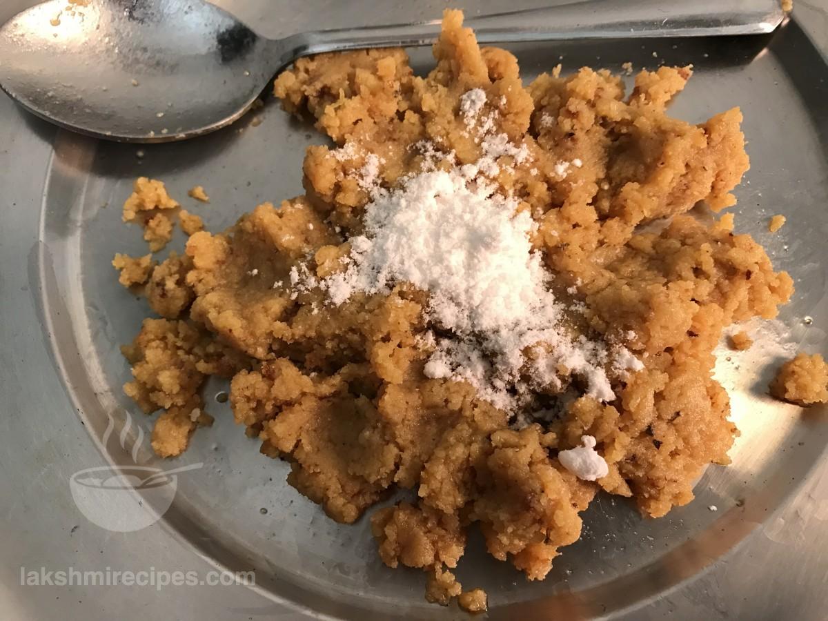 - When the cooked khoya is slightly cooled then add powdered sugar and crushed cardamom to it. Mix the ingredients well together.