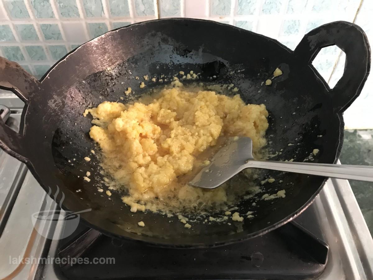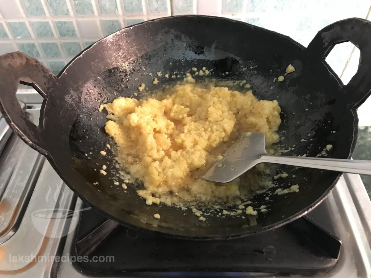 - अब एक छोटा कप देसी घी को कढ़ाई में डालकर गरम कर लें और फिर आंच को मध्यम स्तर तक कम कर दें।