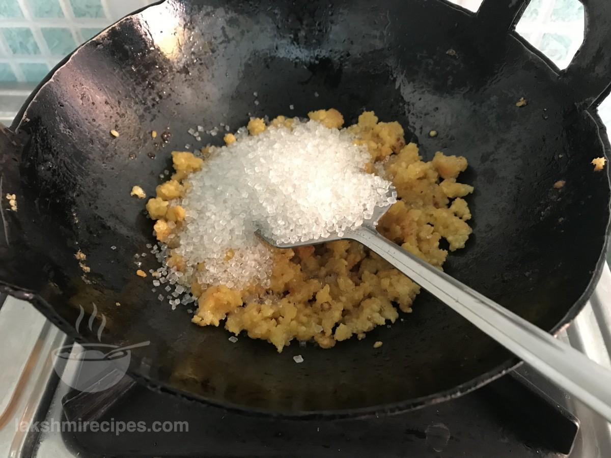 - At this point add sugar to the kadhai followed by water. The amount of water should be enough so that the moong dal is completely submerged in it and there is some water above the layer of moong dal.
