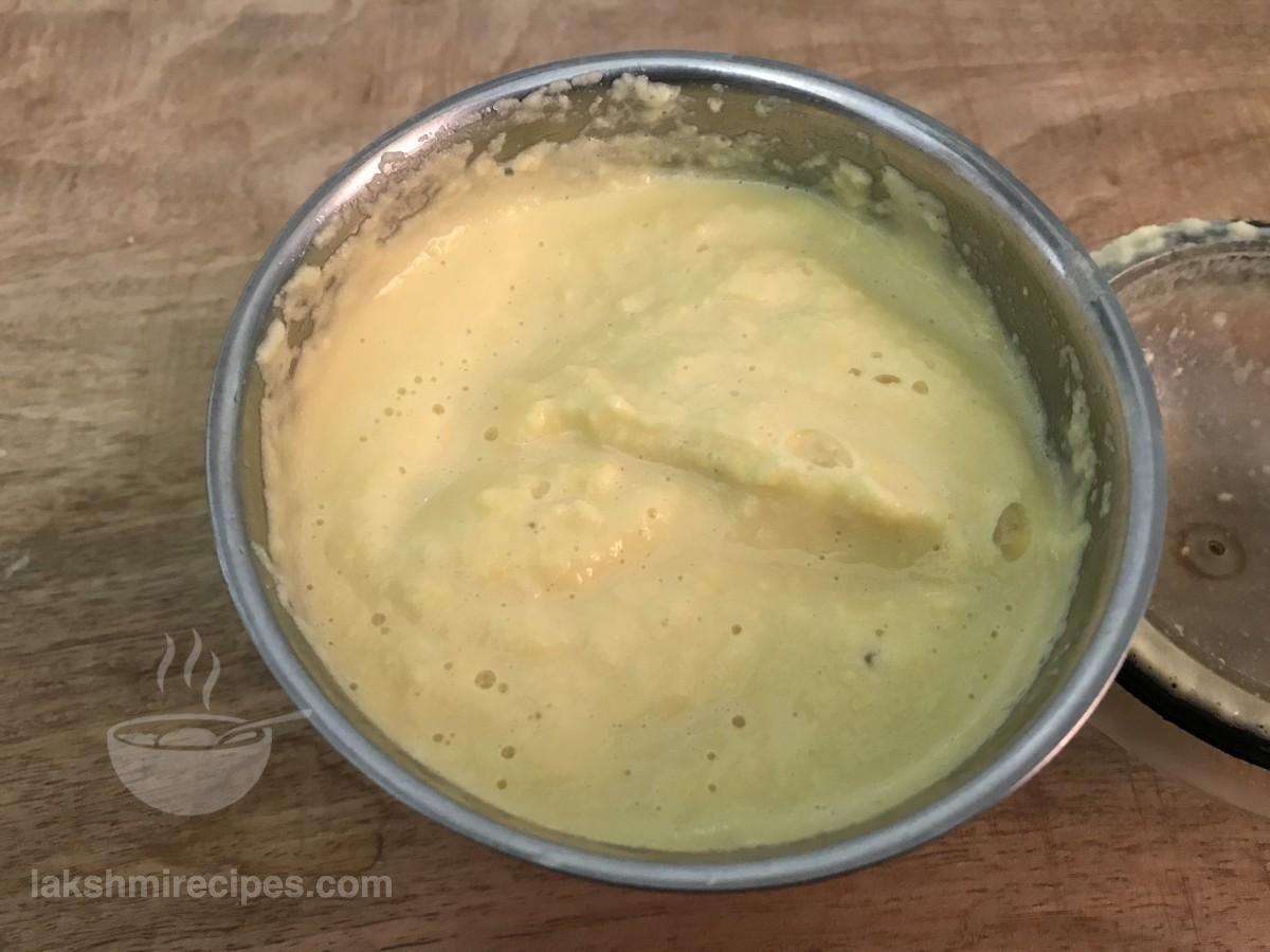 - Transfer the soaked Splitted and Dehusked Green Gram or Dhuli Moong Dal to a mixer jar and coarsely grind it.