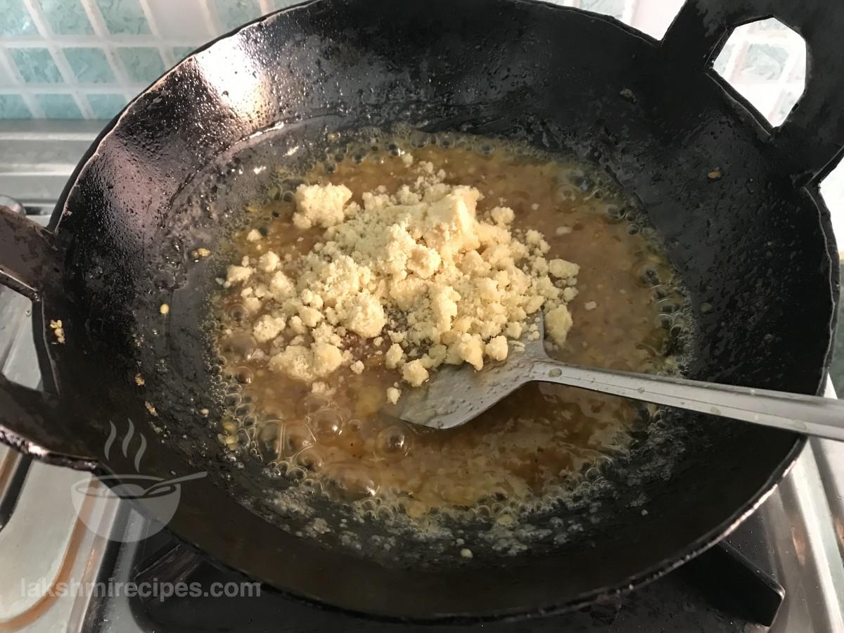 - इसके बाद कढ़ाई में पिसी हुई धुली मूंग दाल डालें। मूंग दाल को कल्छी से अच्छे से कढ़ाई के तले से सटा कर चलाएं और दाल से घी के अलग होने तक चलाकर पकाएँ।